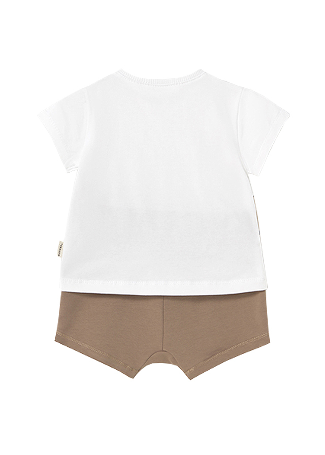 Set 2 piese - Pantaloni+tricou - animaleCompleul pentru baieti este format din: - tricou cu maneca scurta - pantaloni scurtiTricouTricoul cu maneca scurta are gulerul rotund si se inchide cu capse pe umarul stang, pentru a facilita imbracarea bebelusului.