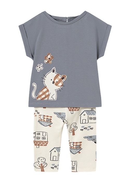 Set 2 piese - Tricou+colanti - pisica Setul pentru fetite este format din: - tricou maneca scurta - colant Tricou maneca scurtaTricoul are maneca scurta si guler rotund.Inchiderea se realizeaza cu nasture pe partea posterioara pentru a usura imbracarea copilului.Desing: imprimeu