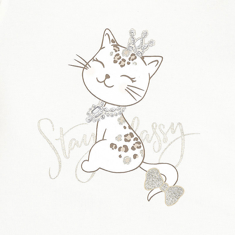 Set 2 piese - Tricou si colanti Compleul pentru fetita este format din: - tricou - pantaloni tip colant Caracteristici:TricouTricoul este cu maneca scurta, gulerul rotund si este imprimat cu o pisica care este decorata cu sclipi si paiete. Material este moale din bumbac elastic.