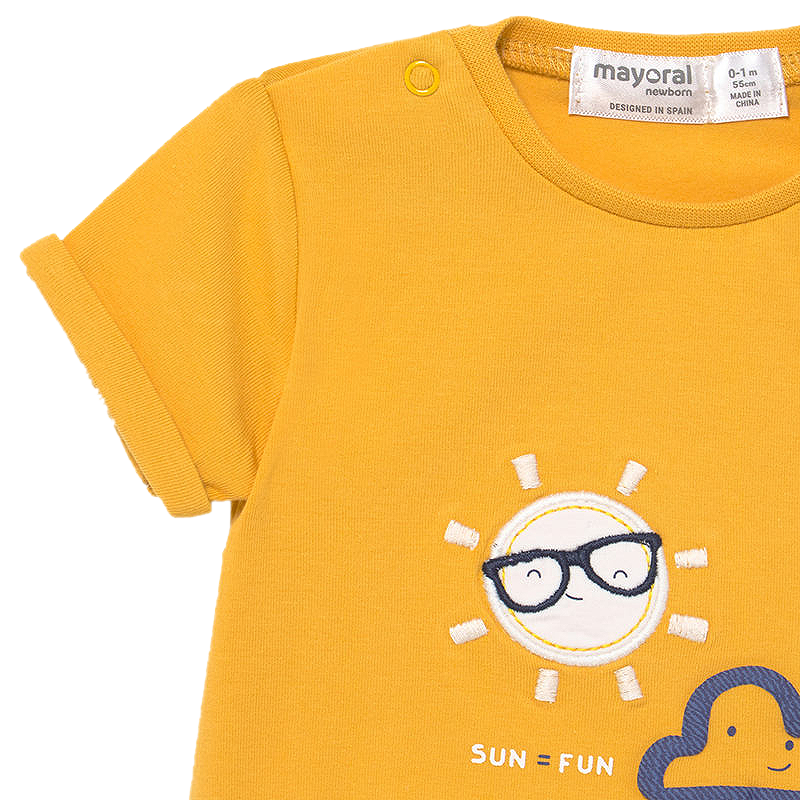 Design: aplicatie soare si norisorMaterial: 95% bumbac / 5% elastanCuloare: galbenIntretinere: Spalare: automata / manuala, cu detergent pentru rufe delicate