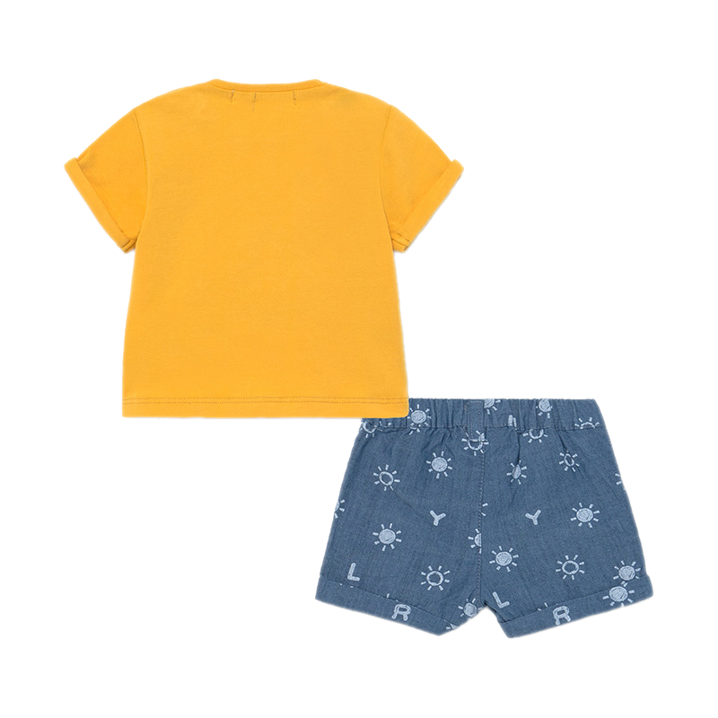 Pantaloni scurtiPantalonii scurti au talie reglabila, inchidere cu nasture si gaici pe talie.Material: 100% bumbac Culoare: albastruImprimeu: soare / litereIntretinere: