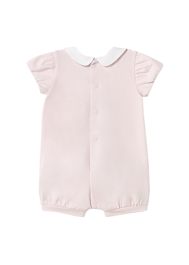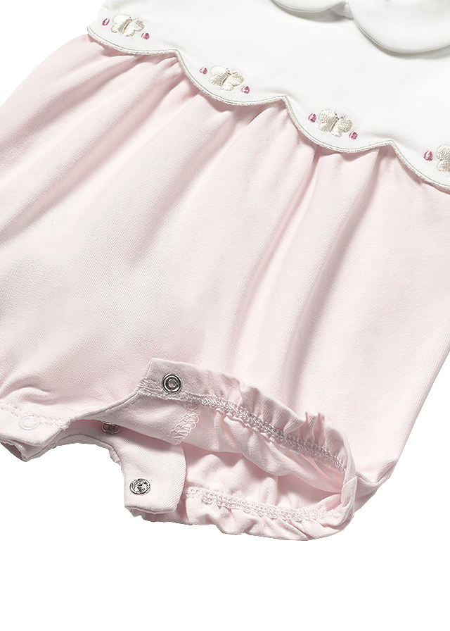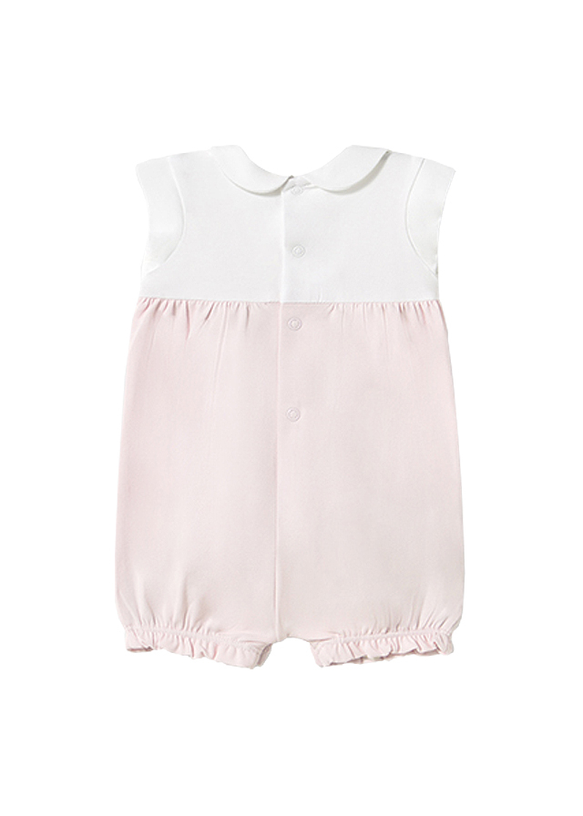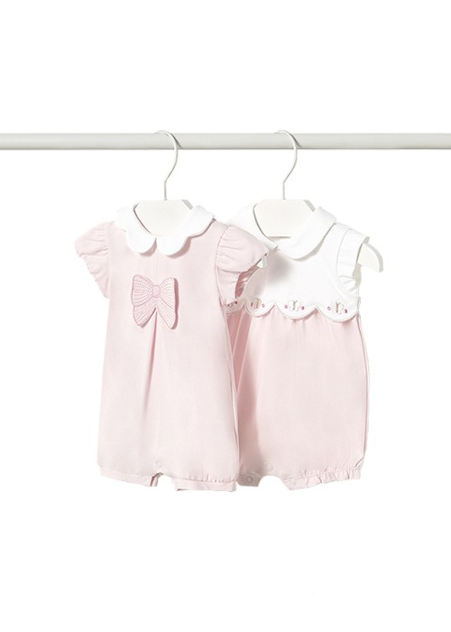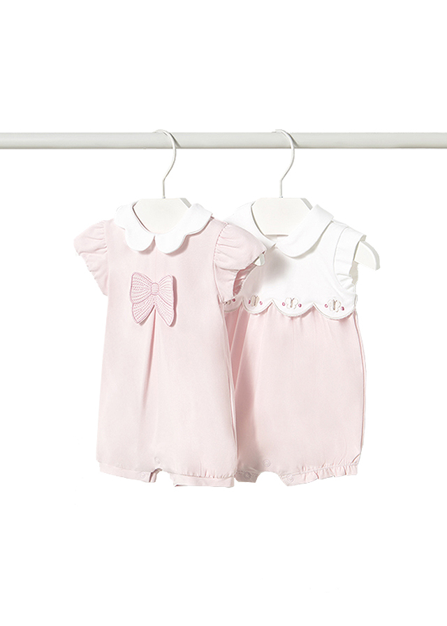 Set 2 - Salopete (pijamale) cu guler, scurteSetul de doua salopete (pijamale) asortate au maneca scurta si gulerul rotund / camasa.Inchiderea se face cu nasturi pe spate, de sus pana jos si pe interiorul picioruselor.Elemente decorative: funda / volanMaterial: 95% bumbac / 5% elastanCuloare: alb / rozIntretinere: