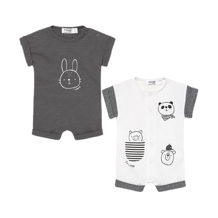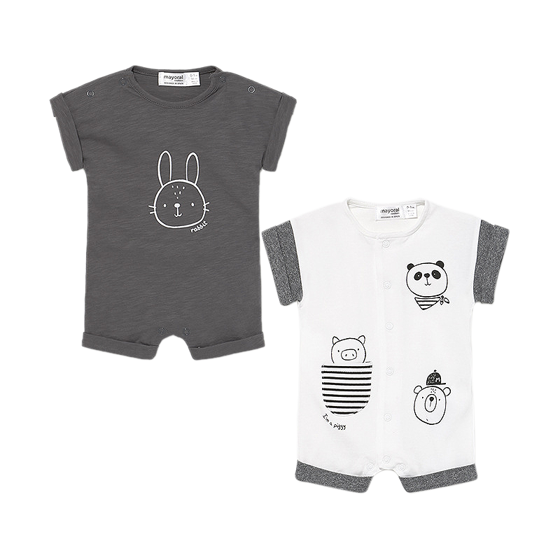 Set 2 salopete scurteSetul de doua salopete asortate, au maneca scurta si guler rotud.Inchiderea se face cu capse pe ambii umeri si in interiorul picioruselor.Material este moale, din bumbac elastic.Material: 95% bumbac / 5% elastanCuloare: alb / griImprimeu: iepuras / urs pandaIntretinere: