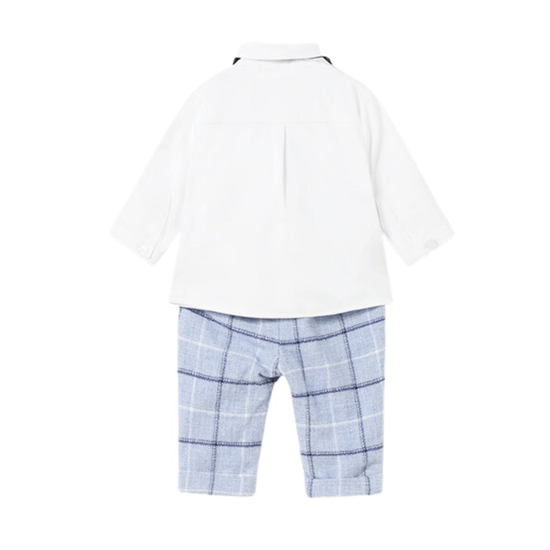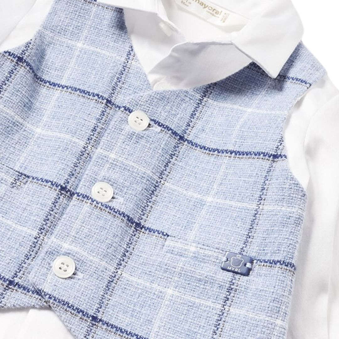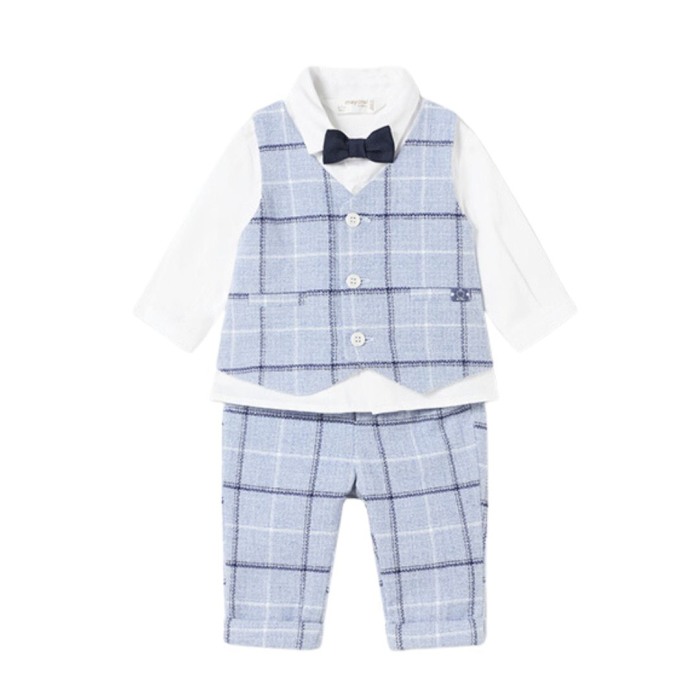 Set 3 piese - camasa + pantaloni lungi + papion - MayoraCamasaCamasa cu maneca lunga, are guler si inchidere cu nasturi in fata. Model cu vesta aplicata si deschidere in fata.Vesta se inchinde cu 3 nasturi in fata si are buzunare aplicate nefunctionale. Vesta este aplicata pe partea din fata a camasii.