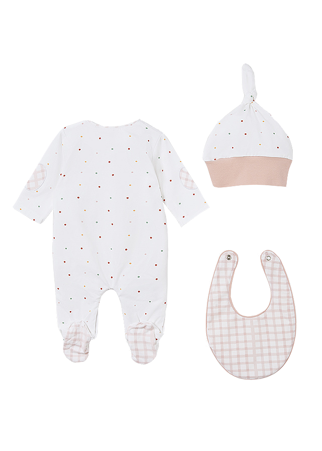Set 3 piese cadou ECOFRIENDS - Animale padureSetul este format din trei piese:    - salopeta    - baveta    - caciulitaSalopeta are maneca lunga, guler rotud si botosi.Inchiderea se face cu capse pe partea stanga in diagonala si pe interiorul picioruselor.Material este moale, din bumbac sustenabil.Baveta se foloseste in perioada eruptiilor dentare sau cand incepi diversificarea mancarurilor, iar in momentul acela vei avea nevoie de ea cu siguranta.Prinderea se realizeaza printr-o capsa la spate.Caciulita este din bumbac si are imprimeu.Este excelenta in serile racoroase cand mergi la plimbare si este utila inca din primele zile de viata.Material:  salopeta - 95% bumbac / 5% elastan                    baveta - exterior - 95% bumbac / 5% elastan                                   captuseala - 95% bumbac / 5% elastan                    caciulita - exterior -95% bumbac / 5% elastan                                      captuseala - 100% bumbacCuloare: alb / rozImprimeu: animale padure / picateleIntretinere: