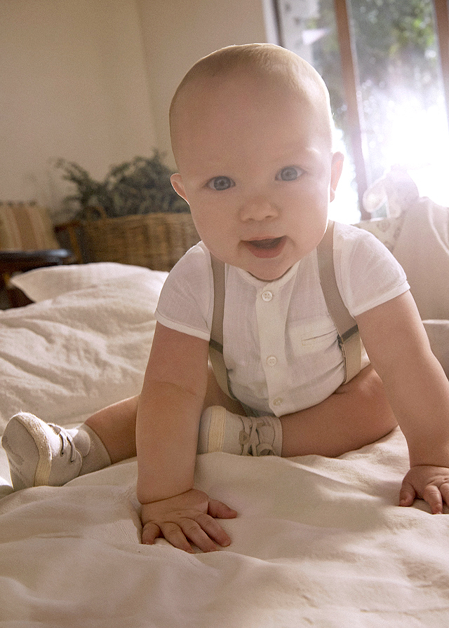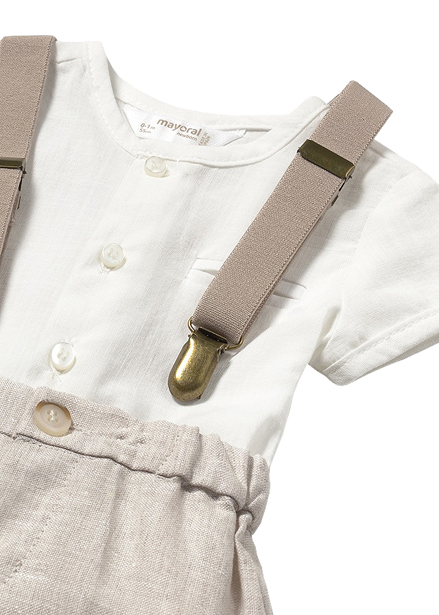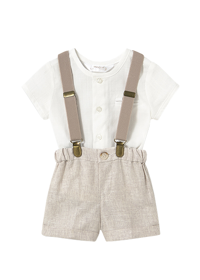 Set 3 piese - camasa + pantaloni scurti + bretele CamasaCamasa cu maneca scurta, are gulerul rotund si inchidere cu nasturi in fata. Model cu deschideri laterale pe tiv pentru lejeritate.