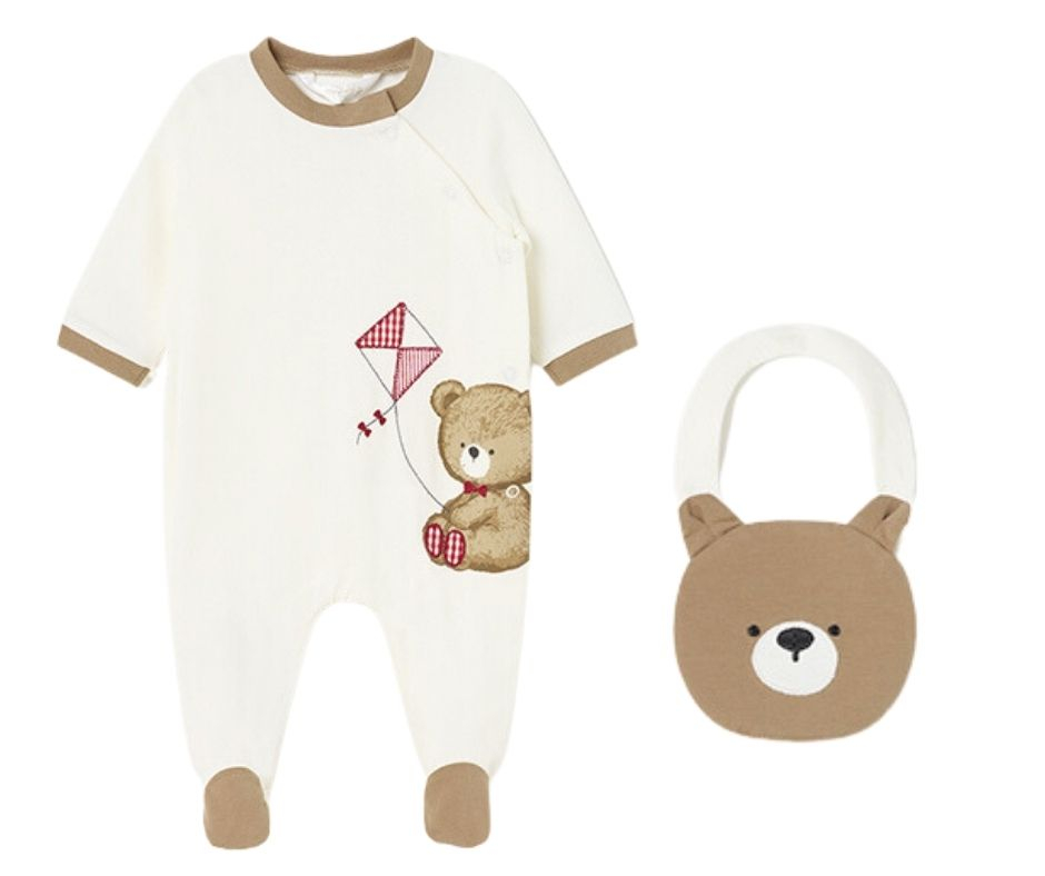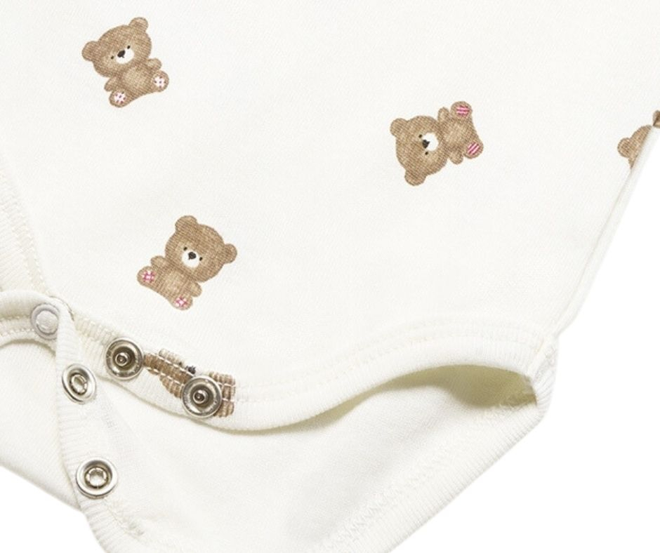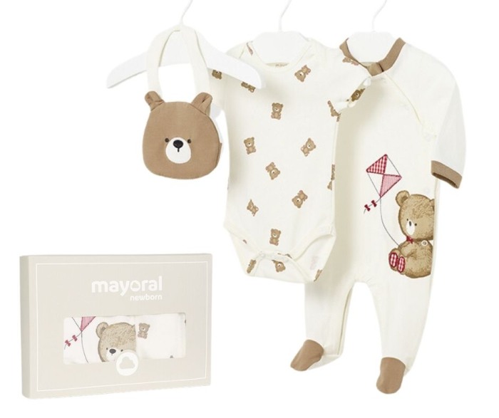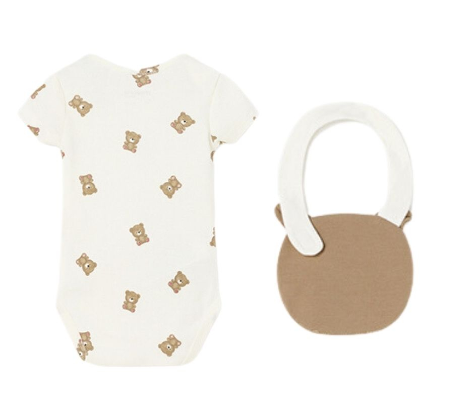 Set 3 piese ECOFRIENDS - ursulet Setul contine o salopeta (pijama) cu maneca lunga, un body cu maneca scurta si o bavetaSetul se prezinta intr-o cutie din linia Newborn, ideala pentru cadou la nastere, la prima vizita sau oricand doresti sa daruiesti ceva practic si inspirat.Salopeta are guler rotund si inchiderea se face cu capse pe partea stanga / fata salopetei si pe interiorul picioruselor.Material este moale, din bumbac sustenabil.Aplicatii: ursulet bej cu zmeuBody-ul cu maneca scurta are inchidere si intre picioruse pentru a imbraca usor bebelusul.Baveta se foloseste in perioada eruptiilor dentare sau cand incepi diversificarea mancarurilor, iar in momentul acela vei avea nevoie de ea cu siguranta. Elemente decorative: forma capului unui ursuletMaterial: salopeta - 94% Bumbac 6% Elastan body - 100% bumbac baveta - exterior - 94% Bumbac 6% Elastan captuseala - 94% Bumbac 6% ElastanCuloare: off white /bej/maroImprimeu: ursi Intretinere: