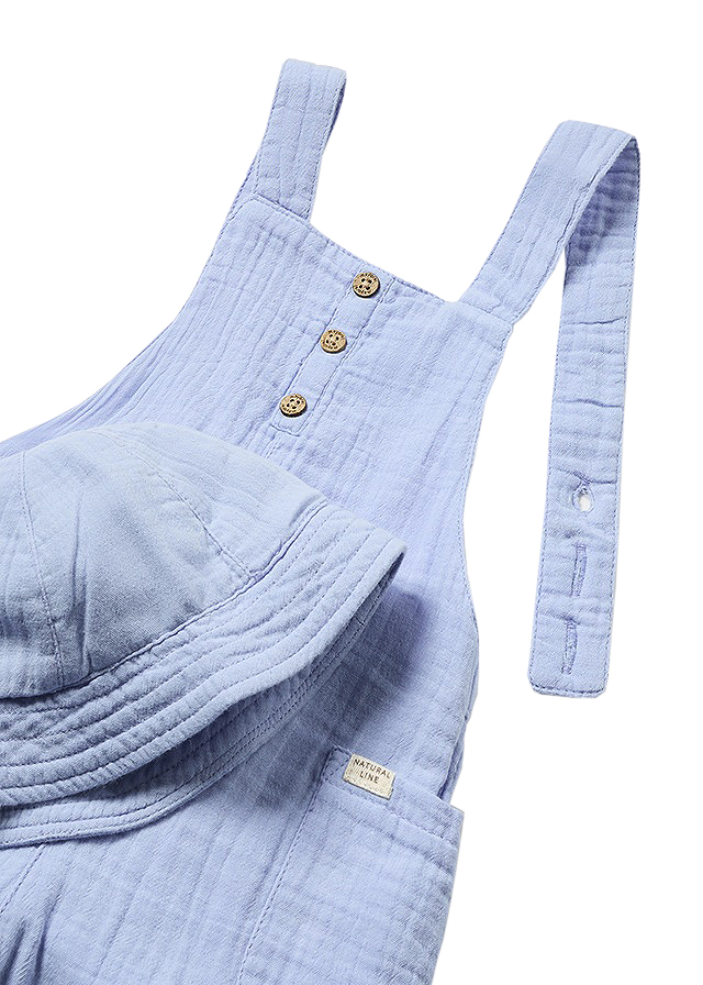 Salopeta si palarie din muselina cu breteleSalopeta are pieptar cu bretele. Inchiderea se face cu nasturi.Buzunarele sunt functionale pe partea frontala a salopetei.Palaria este din acelasi material si culoare.