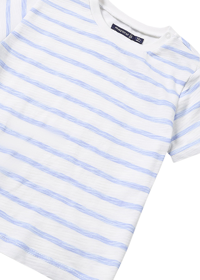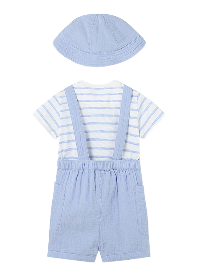 Set 3 piese dungi bleu Better Cotton - MayoralCompleul pentru baieti este format din: - tricou cu maneca scurta - salopeta blugi cu bretele - palarieTricouTricoul cu maneca scurta are gulerul rotund si se inchide cu capse pe umarul stang, pentru a facilita imbracarea bebelusului.