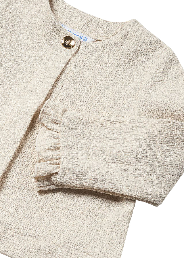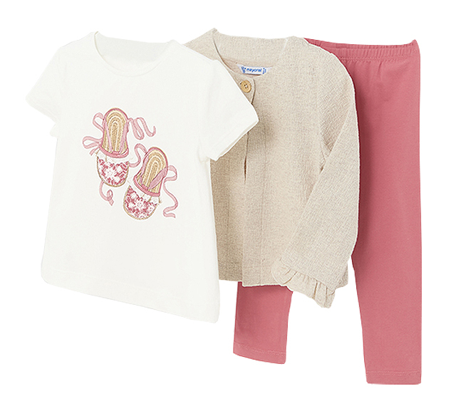 Set 3 piese, espadrile, fata Compleul pentru fetite este format din: - 1 bolero - 1 tricour cu maneca scurta - 1 colant lungBoleroBoleroul are maneci lungi cu volanase si gulerul rotund.Inchiderea se face cu un singur nasture pe decolteu.Material: 57% bumbac / 40% poliester / 3% fibre metaliceCuloare: bejIntretinere: Spalare: automata / manuala, cu detergent pentru rufe delicate Temperatura: max. 30°C Stoarcere: automata (numar mediu de rot/min) / manuala Interzis: albirea, curatarea chimica si uscarea la tambur Calcare: max. 110°C, de preferat fara aburTricouTricoul are maneca scurta si guler rotund.Material: 95% bumbac / 5% elastanCuloare: albDesign: espadrileIntretinere: