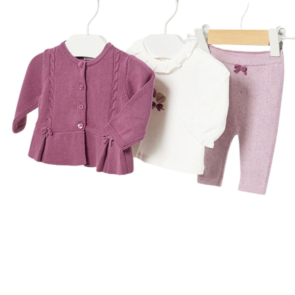Set 3 piese Magenta tricot bumbac BCI nou-nascut Set pentru fetite format din trei piese: - jacheta tricot - bluza cu maneca lunga plus - pantaloni lungi tricotJacheta tricotCardigan cu maneca lunga pentru bebe. Guler rotund cu volanas din panza. Inchidere cu nasturir pe partea frontala. Tot pe partea din fata exista un model tricotat, doua pliseuri si doua fundite.Materialul ofera confort, este moale si placut la atingere. Material: 100% bumbac Culoare: magentaIntretinere:
