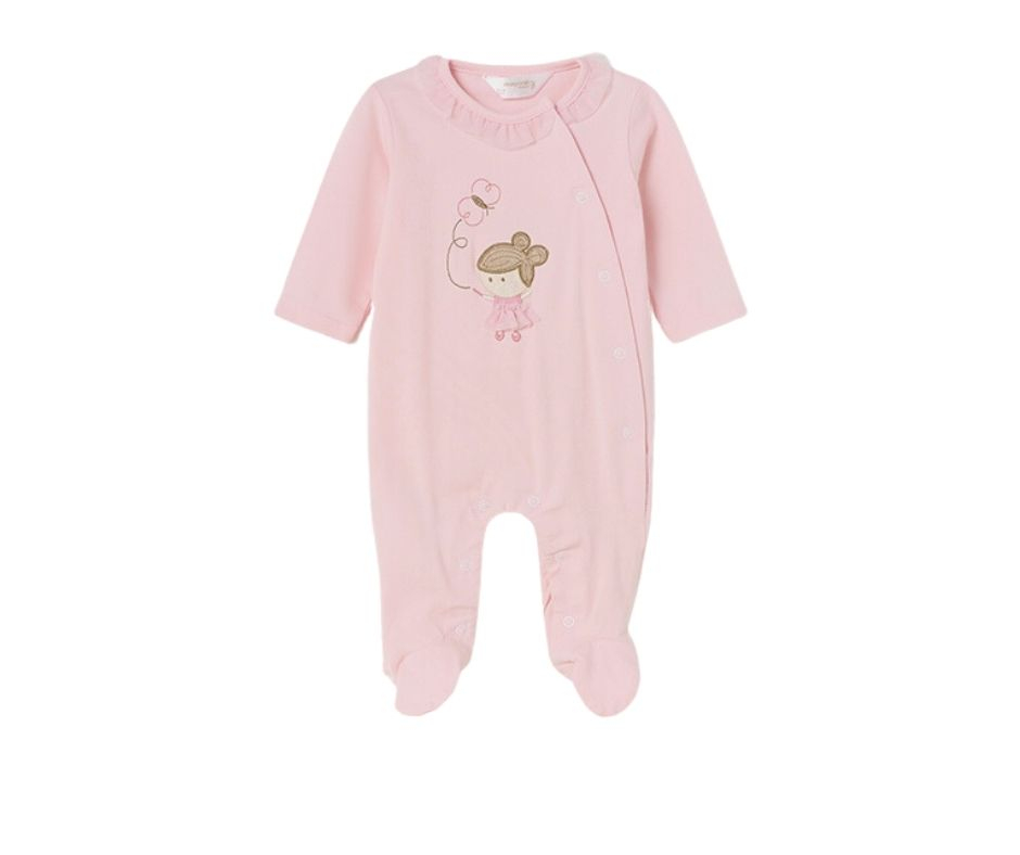 Calcare: max. 110°C, de preferat fara aburSalopetaPijama cu maneca lunga pentru nou-nascut. Inchidere cu capse intre picioare pentru a facilita imbracarea si  Inchidere cu capse si pe partea frontala. Marimile mari ale acestui model (12 luni si 18 luni) au talpa antiderapanta. Fuler rotund cu volanas aplicat.