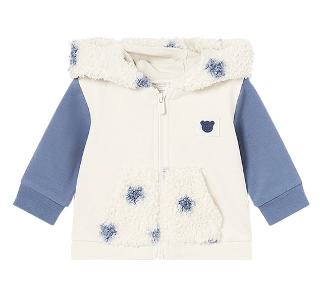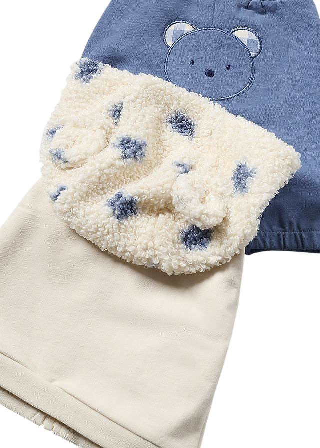Set 3 piese - Trening cu urechi, baietiTrening pentru baieti format din trei piese:    - hanorac    - bluza cu maneca lunga    - pantaloni lungiHanoracHanoracul cu maneca lunga are guler rotund si se inchide cu fermoar in fata.Acest model are gluga cu urechise. Materialul este format din mixt de  tesuturi combinate, pentru a realiza un design unic si diferit. Tivul este elastic pentru o mai buna ajustare. Gluga si buzunarele sunt din blanita.Buzunarele sunt functionale pe partea frontala. Materialul este moale si placut la atingere ce ofera un confort.Elemente decorative: aplicatii urechiuse / buzunare aplicate si urs brodat pe partea din spate