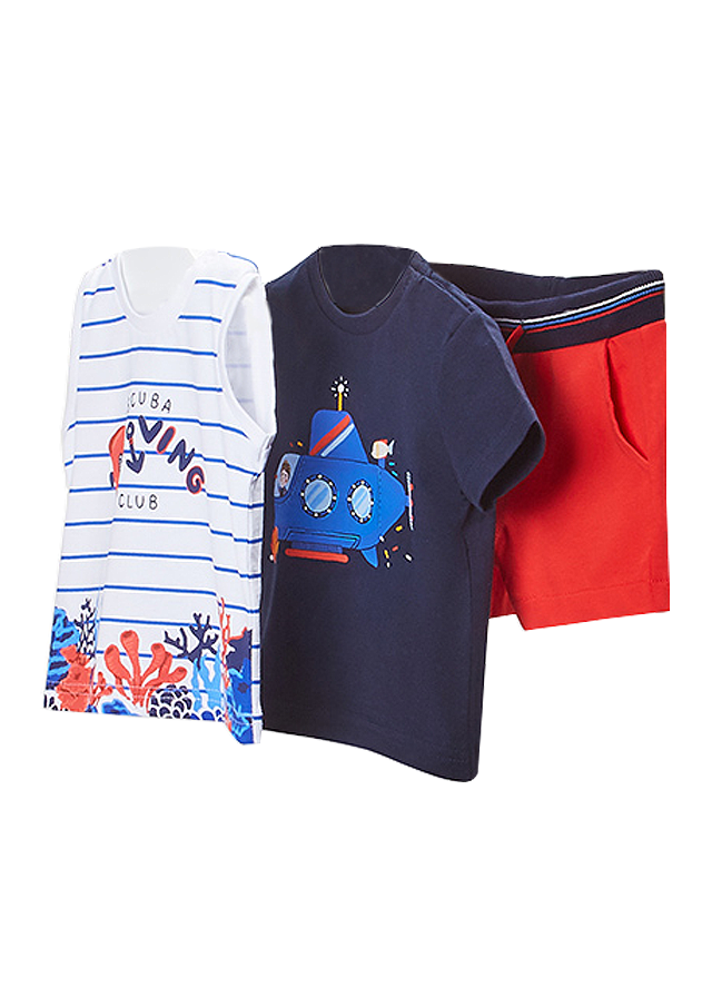 Set 3 piese - Tricou+maiou+pantaloni scurti Setul pentru baieti este format din:    - tricou    - maiou    - pantaloni scurtiTricou