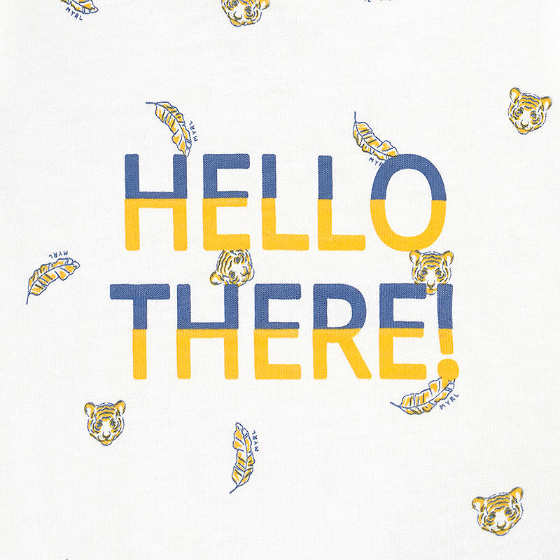 Material fluid si elastic pentru un confort maxim zi de zi.Material: 100% bumbacCuloare: albImprimeu: tigriIntretinere: Spalare: automata / manuala, cu detergent pentru rufe delicate Temperatura: max. 30°C Stoarcere: automata (numar mediu de rot/min) / manuala Interzis: albirea, curatarea chimica si uscarea la tambur Calcare: max. 110°C, de preferat fara aburPantaloni scurtiPantalonii scurti au talie elastica prin cordon ajustabil, cu buzunare functionale.Material: 99% bumbac / 1% elastan Culoare: galben / bleumarinIntretinere: Spalare: automata / manuala, cu detergent pentru rufe delicate