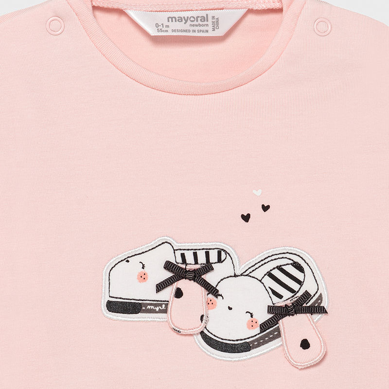 Calcare: max. 110°C, de preferat fara aburTricouriTricoul cu maneca lunga, are guler rotund si inchidere cu capse pe spate / umeri, pentru a usura imbracarea micutei.Elemente decorative: desen pe partea frontala, fundite