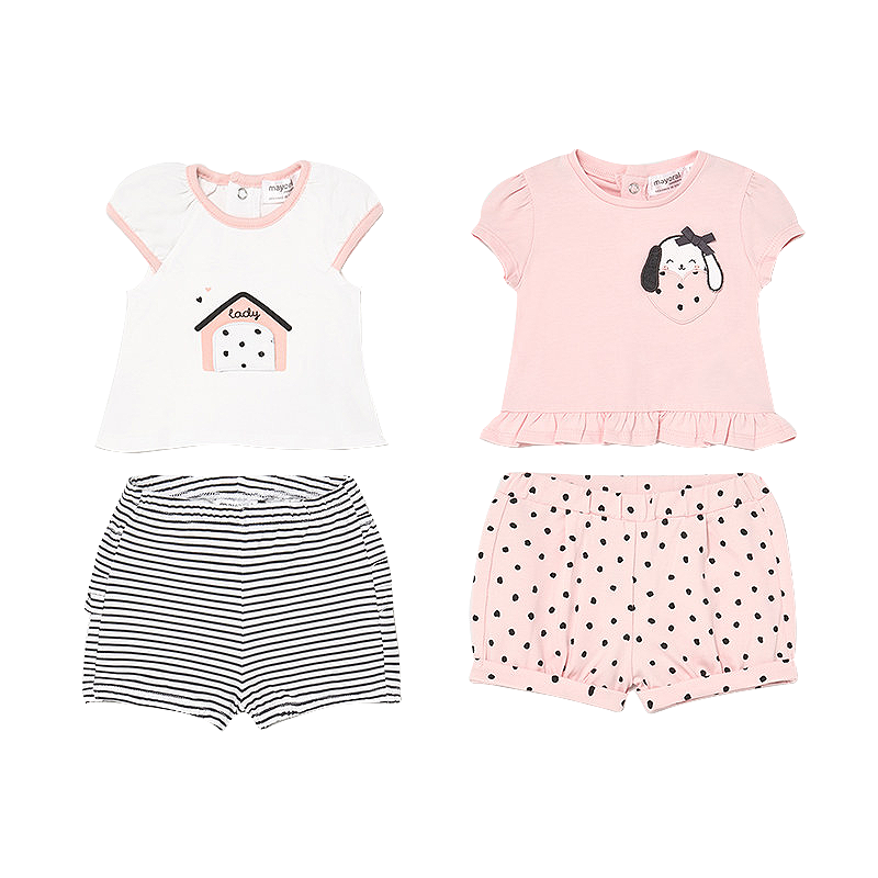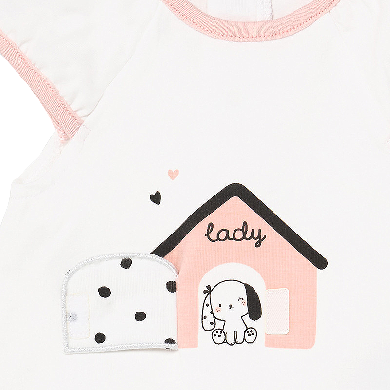 Design: casuta / catelus / volaneMaterial: 95% bumbac / 5% elastanCuloare: alb / rozIntretinere: Spalare: automata / manuala, cu detergent pentru rufe delicate
