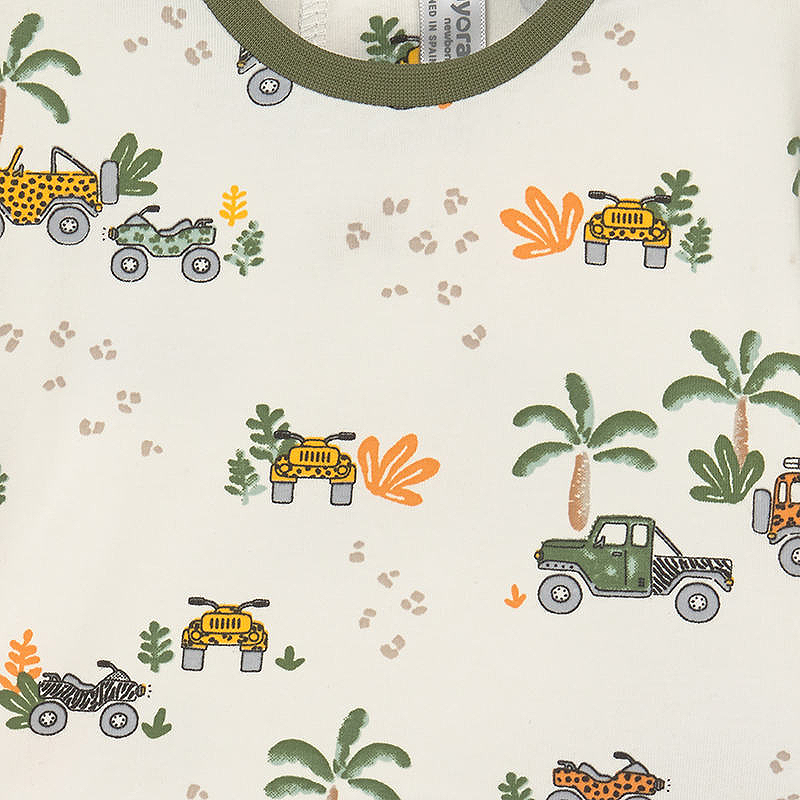 Design: palmieri / masinute / animaleMaterial: 95% bumbac / 5% elastanCuloare: alb / kakiIntretinere: Spalare: automata / manuala, cu detergent pentru rufe delicate