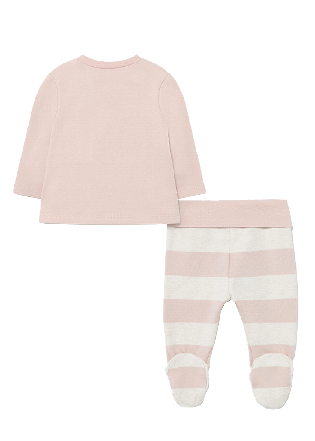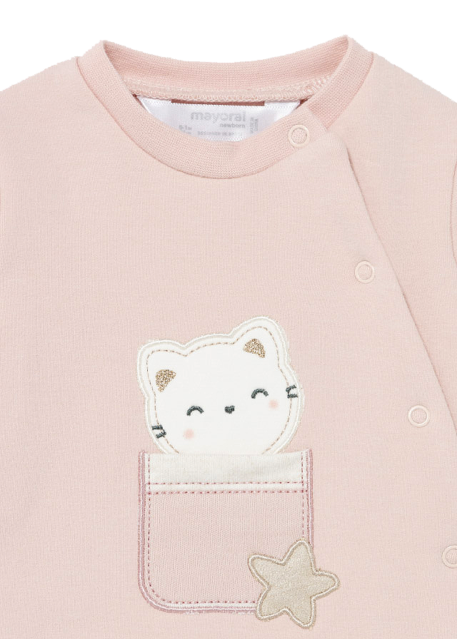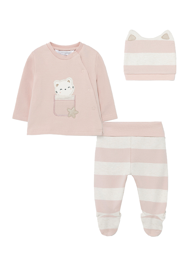 Bluza cu maneca lunga are guler rotund, iar inchiderea se face cu capse pe fata, pentru a facilita imbracarea bebelusului.Material moale din bumbac elastic.Elemente decorative: aplicatieMaterial: 95% bumbac / 4% elastan / 1% poliesterCuloare: rozImprimeu: pisicuteIntretinere: Spalare: automata / manuala Temperatura: max. 30°C Stoarcere: automata (numar mediu de rot/min) / manuala Interzis: albirea, curatarea chimica si uscarea la tambur Calcare: max. 110°CPantaloni cu botoseiAcesti pantaloni sunt confortabili, rezistenti si practici pentru ca acopera piciorusul si nu are nevoie de sosete.In talie are o banda elastica moale.Ideali in primele luni de viata.Sunt de nelipsit din dulapul unui bebelus.Material: 98% bumbac / 2% elastanCuloare: roz / albIntretinere: Spalare: automata / manuala Temperatura: max. 30°C Stoarcere: automata (numar mediu de rot/min) / manuala Interzis: albirea, curatarea chimica si uscarea la tambur Calcare: max. 110°CCaciulitaCaciula este confectionata din materiale calduroase si flexibile.Aceasta garanteaza o ajustare perfecta pe cap si un confort maxim pentru protejarea impotriva frigului.Material: 98% bumbac / 2% elastanCuloare: roz / albIntretinere: Spalare: automata / manuala Temperatura: max. 30°C Stoarcere: automata (numar mediu de rot/min) / manuala Interzis: albirea, curatarea chimica si uscarea la tambur Calcare: max. 110°C
