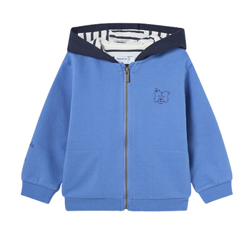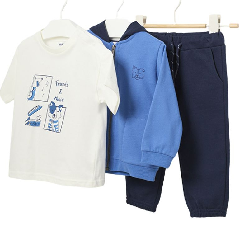 Trening 3 piese - Albastru -  Friends&Music Mayoral Trening pentru baieti format din trei piese:    - hanorac cu fermoar    - bluza cu maneca scurta    - pantaloni lungiHanorac cu fermoarHanoracul cu maneca lunga are guler rotund, gluga si se inchide cu fermoar in fata.Materialul este moale si placut la atingere si ofera confort. Elemente decorative: buzunareMaterial:  59% Bumbac 40% Poliester 1%Culoare: albastru/bleumarin/ albImprimeu: un catelusIntretinere: