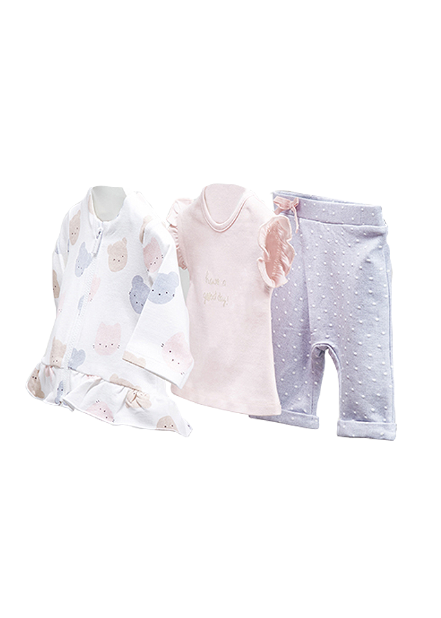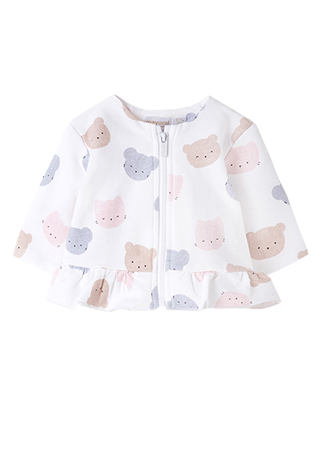 Trening 3 piese, fetite - ECOFRIENDSTrening pentru fetite format din trei piese:    - hanorac    - bluza cu maneca scurta    - pantaloni lungiHanoracHanoracul cu maneca lunga are guler rotund si se inchide cu fermoar in fata.Materialul ofera confort, fiind moale si placut la atingere. Design cu terminatii ondulate. Material:  95% bumbac / 5% elastanCuloare: albImprimeu: ursuletiIntretinere: