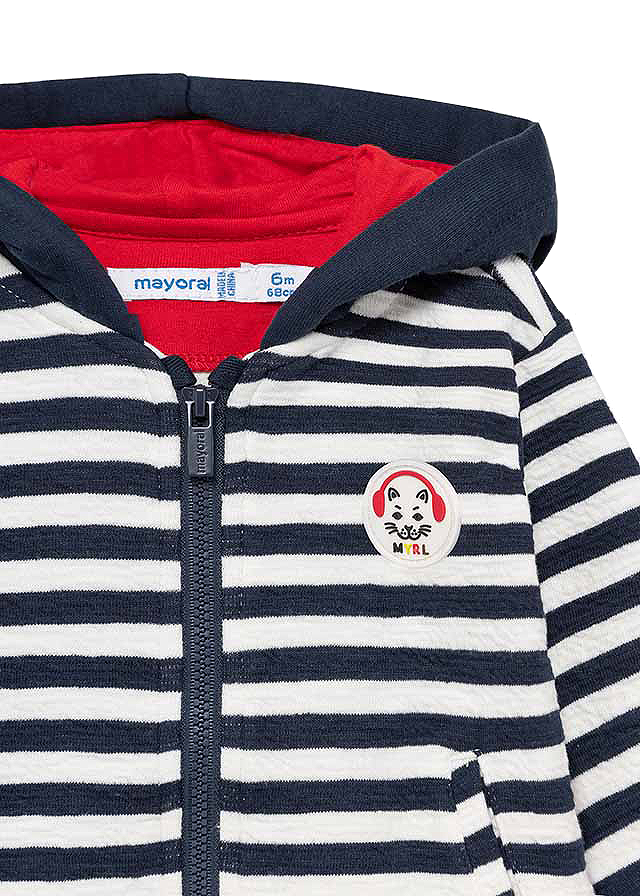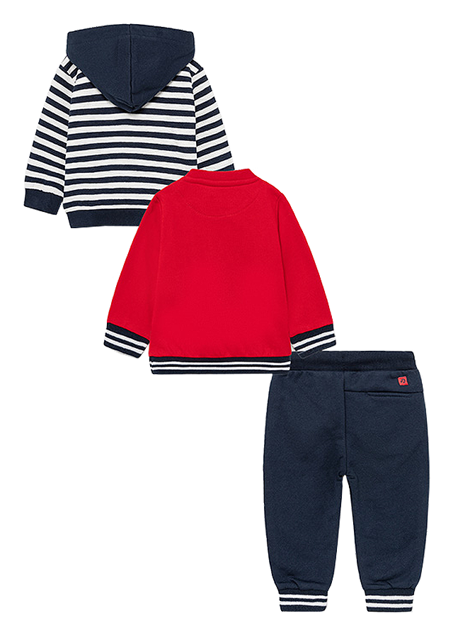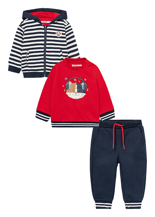 Trening, 3 piese - Pisica Material calduros gros, special pentru a proteja impotriva frigului.Setul cuprinde: - hanorac - pantalon lung - bluza cu maneca lungaHanoracHanorac cu maneca lunga si detalii in contrast pentru bebe baiat de la 6 la 36 Luni. Guler cu gluga. Inchidere centrala cu fermoar. Tiv cu elastic pentru o mai buna ajustare. Motiv in dungi.Hanoracul are mansete elastice, buzunare si gluga, cu detalii in contrast.Acesta are inchidere centrala cu fermoar si tiv cu elastic pentru o mai buna ajustare.Design: motiv in dungi, aplicatieMaterial: 57% bumbac / 37% poliester / 6% elastanCuloare: bleumarin / albIntretinere: