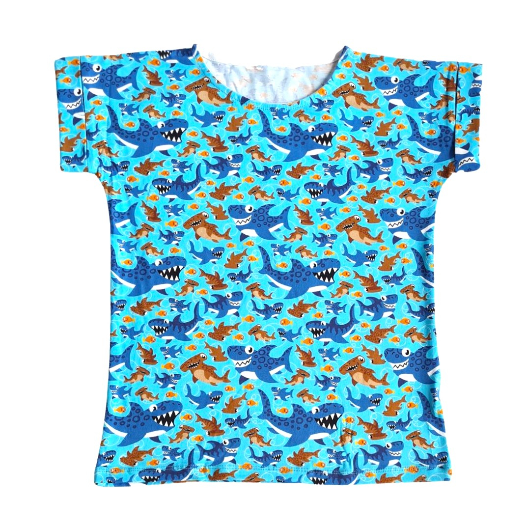 Tricou cu maneca scurta - RechiniTricoul este rotund la gat si are maneca scurta dublata.Materialul este de buna calitate, rezistent la spalat, iar culorile se pastreaza in timp.Material: 100% bumbacCuloare: albastru Imprimeu: rechiniIntretinere: