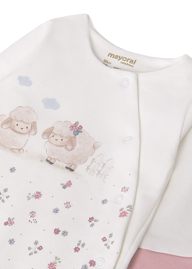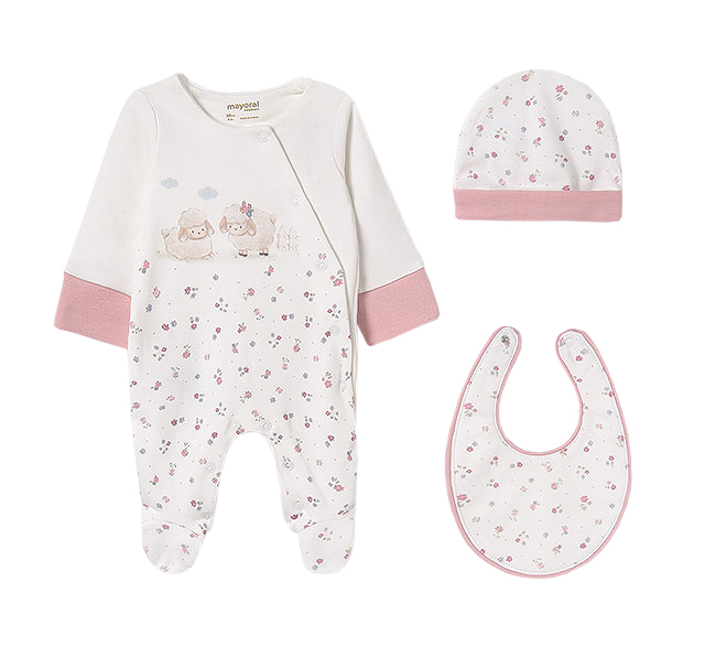 Set 3 piese cadou - Oite Setul este format din trei piese: - salopeta - baveta - caciulitaSalopeta are maneca lunga, guler rotud si botosi.Inchiderea se face cu capse pe partea stanga in diagonala si pe interiorul picioruselor.Material este moale, din bumbac sustenabil.Baveta se foloseste in perioada eruptiilor dentare sau cand incepi diversificarea mancarurilor, iar in momentul acela vei avea nevoie de ea cu siguranta.Prinderea se realizeaza printr-o capsa la spate.Caciulita este excelenta in serile racoroase cand mergi la plimbare si este utila inca din primele zile de viata.Material: salopeta - 99% bumbac / 1% elastan baveta - exterior - 100% bumbac captuseala - 100% bumbac caciulita - exterior -99% bumbac / 1% Elastan captuseala - 100% bumbacCuloare: alb / rozImprimeu: oite / floriceleIntretinere: