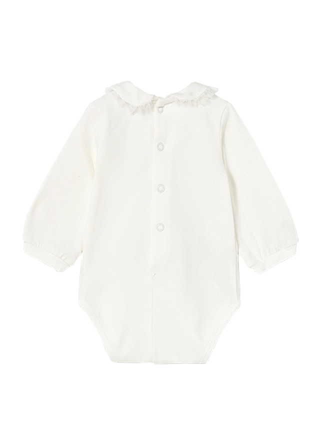 Body-ul cu maneca lunga are guler rotund cu volanase si mansete elastice.Inchiderea se face cu capse pe partea posterioara si intre picioruse, pentru a facilita imbracarea bebelusului.Tesatura popelin durabila si usor de ingrijit.