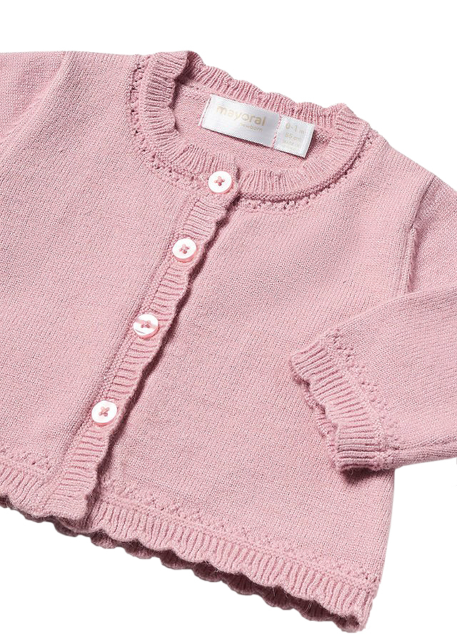 Jacheta are maneca lunga, guler rotund, iar Inchiderea cu nasturi pe partea frontala. Gulerul, mansetele si baza jachetei sunt dantelate din acelasi tricot.Materialul ofera confort, este moale si placut la atingere.