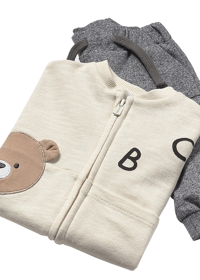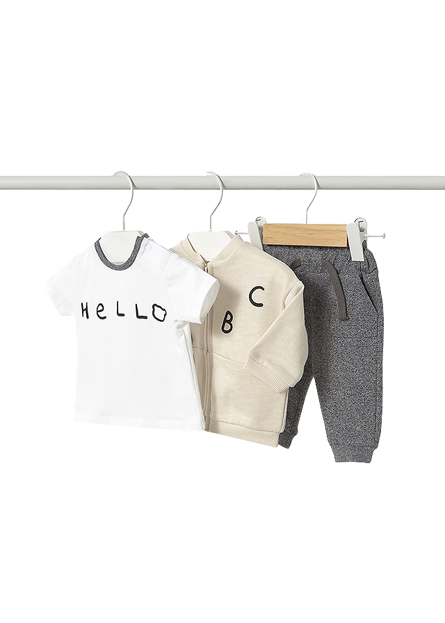 Trening 3 piese - LitereTrening pentru baieti format din trei piese: - hanorac cu fermoar - bluza cu maneca scurta - pantaloni lungiHanorac cu fermoarHanoracul cu maneca lunga are gulerul rotund, buzunare functionale si se inchide cu fermoar in fata.Materialul este moale si placut la atingere si ofera confort. Desing: ursulet, litereMaterial: 95% bumbac / 5% elastanCuloare: bejImprimeu: litereIntretinere: