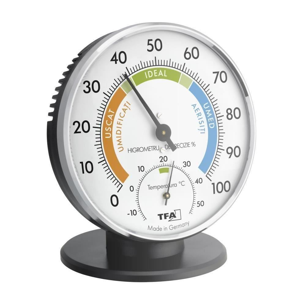 Termometru si Higrometru clasic de precizie TFA Caracteristici:- Masoara cu precizie temperatura si umiditatea din camera, pentru a oferi un climat sanatos;- Ecran foarte mare cu diametru 10 cm, ce semnalizeaza in diverse culori zonele de confort;- Regiunile colorate ale ecranului indica gradul de confort climatic al incaperii respective: conditii ideale, daca este nevoie de aerisirea ori de umidificarea incaperii. ECRAN PERSONALIZAT IN LIMBA ROMANA!- Higrometru de mare precizie cu fir de par sintetic, ce permite reglarea ulterioara pentru a asigura o afisare corecta de-a lungul intregii scale pentru mult timp- Prevazut cu suport demontabil pentru a putea fi asezat pe o suprafata plana sau pentru a fi agatat pe perete- Design elegant cu scala vizibila si rama cromata- Nu necesita folosirea de baterii- Aria de masurare: Temperatura -15...55 °C ; Umiditate 0...100%Fabricat in Germania