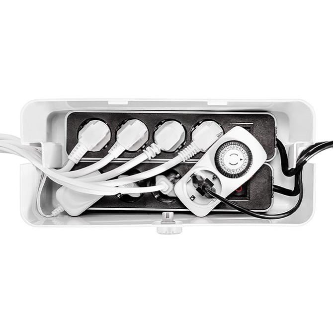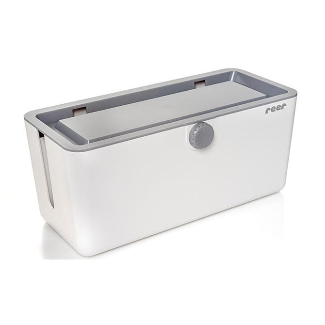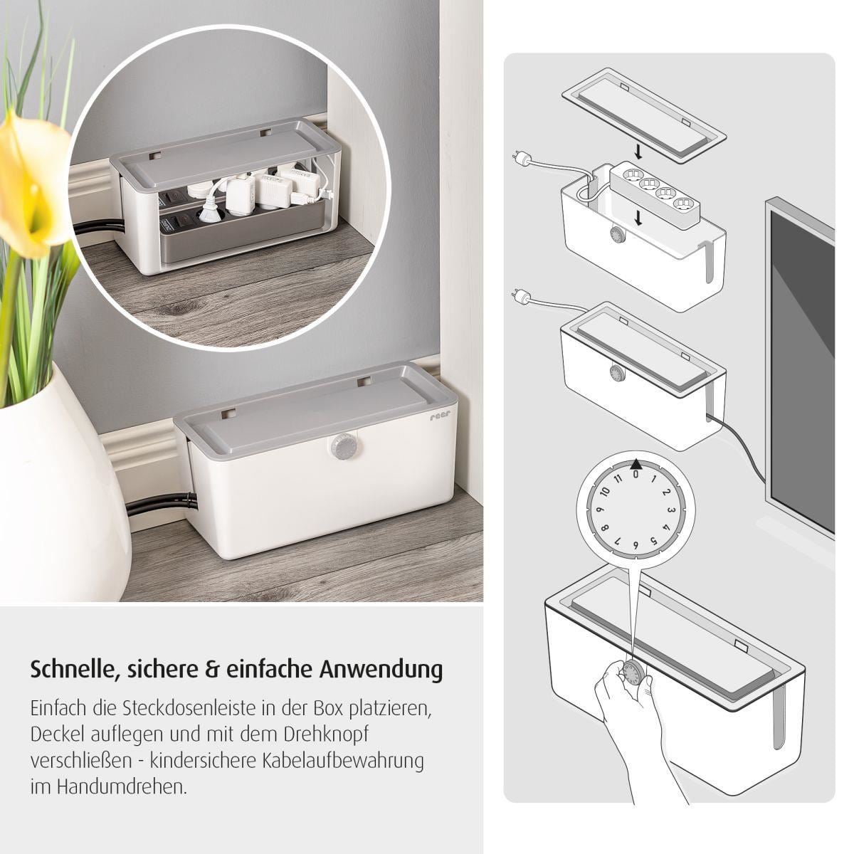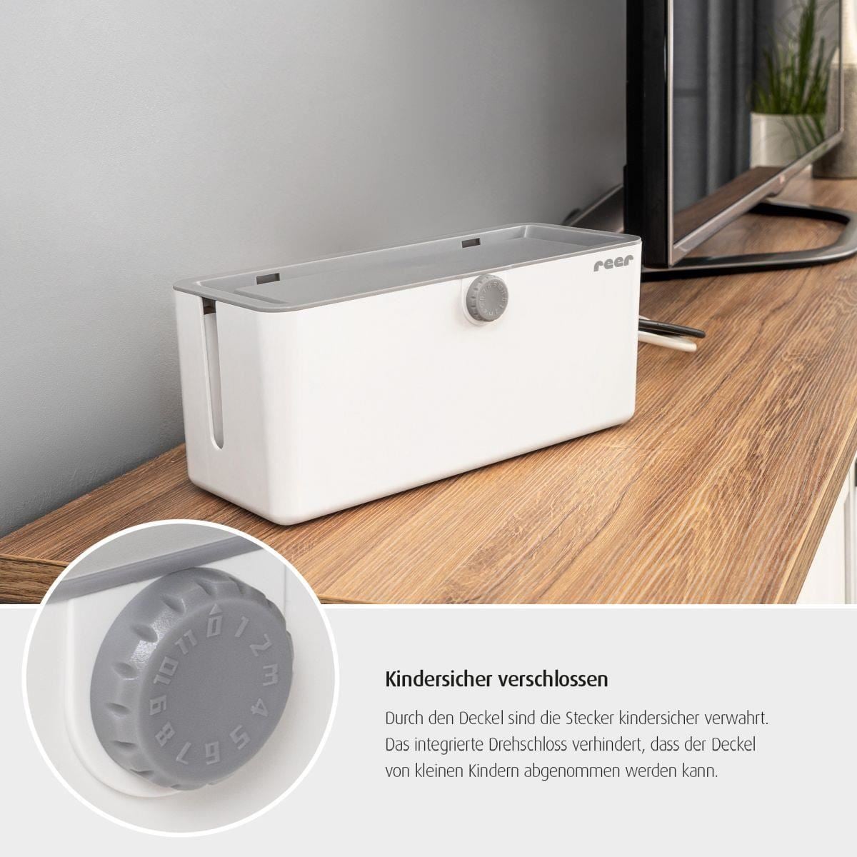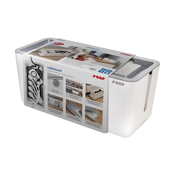 Protejeaza-ti bebelusul si mentine ordinea Cand bebelusii incep sa mearga de-a busilea si sa invete sa mearga in picioare, nu poti feri nimic de curiozitatea lor si de dorinta de a descoperi totul. Prin urmare, ca parinte, te straduisti sa creezi un mediu sigur pentru ei si sa minimalizezi sursele de pericol. Accidentele electrice sunt deosebit de periculoase, asa ca sursele de curent trebuie asigurate in mod eficient. Cutia de cabluri CableGuard de la Reer creeaza ordine si ascunde eficient si estestic stecherele si firele din calea copiilor. Siguranta garantata datorita capacului care se inchide si se blocheazaIn special prizele si ledurile acestora cu lumina lor rosie stralucitoare exercita o mare atractie asupra bebelusilor, in faza de descoperire. Datorita capacului, cablurile sunt ferite de copii. Blocarea rotativa integrata ii impiedica pe copiii mici sa scoata capacul si sa ajunga la prizele periculoase.Previi si pericolele de impiedicare Deoarece prizele sunt adesea aproape de podea, este dificil sa evitam plasarea cablurilor pe podea. Cabluri intinse pe jos pot deveni rapid o piedica, la propriu, in calea bebelusilor ale caror picioare inca sunt tremurande. Cablurile lungi prezinta, de asemenea, un risc de strangulare daca copilul tau incepe să se joace cu ele. Cutia CableGuard aduce ordine in dezordinea cablurilor si protejeaza copilul de accidente periculoase.Spatioasa si cu bucse pentru cabluri integrate in capacCutia de cabluri organizeaza usor orice tip de cabluri si stechere, cu o dimensiune generoasa de 30,5 x 13,5 x 13,5 cm. Este foarte utila pentru a ordona cablurile de pe sau de sub biroul tau aglomerat, precum si oriunde altundeva se aduna multe cabluri. Este potrivita pentru prelungitoare cu 3 si 4 prize cu comutatoare, temporizatoare sau incarcatoare. Trecerile pentru cablu din capac faciliteaza incarcarea telefoanelor mobile si a tabletelor, fara a fi nevoie sa cauti cablul de incarcare respectiv.Fara risc de acumulare de caldura datorita fantelor de ventilatie integrateCablurile de incarcare se pot supraincalzi si ele. Pentru a va proteja dispozitivele, este necesara circulatia permanenta a aerului in cutie. Din acest motiv, la etajul inferior au fost integrate fante de ventilatie. Orificiile laterale sustin acest proces si permit directionarea cablurilor intr-o maniera ordonata, ceea ce impiedica ruperea lor.Detalii produs:- pentru depozitarea in siguranta pentru copii a cablurilor, stecherelor si a prizelor- protejeaza impotriva accidentelor electrice periculoase și a consecintelor acestora- inchidere sigura pentru copii datorita unui buton rotativ special- asigura ordinea in dezordinea cablurilor- previne pericolele de impiedicare si riscul de strangulare cauzat de cablurile aflate in jur- orificiile practice pentru cabluri si fantele de ventilatie permit circulatia permanentă a aerului, pentru a evita supraincalzirea- plasticul ABS usor de întretinut face ca intreaga carcasa sa fie deosebit de rezistenta si durabila.- cu picioare din cauciuc pentru un suport antiderapant- design subtil, modern: potrivit pentru orice mediu de locuit- potrivita pentru prelungitoare cu 3 si 4 prize cu comutatoare- dimensiuni: 30,5 x 13,5 x 13,5 cm