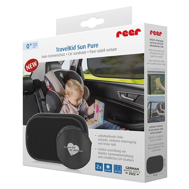 Copiii sunt deseori expusi la soare perioade lungi de timp, in special in calatoriile lungi cu masina si in calatoriile de vacanta. Acest lucru nu este doar foarte neplacut, dar poate duce si la supraincalzire, arsuri solare sau chiar insolatie.Setul de protectie solara pentru masina TravelKid Sun Pure de la Reer, alcatuit din 2 parasolare si o geanta de depozitare adecvata, iti protejeaza in mod sigur copilul de lumina solara daunatoare in masina. TravelKid Sun Pure ofera copilului tau o umbra placuta in masina si impiedica interiorul masinii sa se incalzeasca. Tesatura de inalta calitate are un factor de protectie solara UV 50+ si ofera o protectie completa impotriva razelor solare, protejand copilul impotriva arsurilor solare.Indiferent daca conduceti o autoutilitara, un SUV sau o limuzina sau daca masina dvs. are 3 sau 5 usi, parasolarele TravelKid Sun Pure sunt potrivite pentru majoritatea masinilor. Datorita dimensiunilor sale de 48 x 30.5 cm acopera intotdeauna o mare parte a geamului ferestrei, oferind astfel copilului tau umbra suficienta.Suprafata acoperita cu pelicula a parasolarului este autoadeziva ca urmare a incarcarii electrostatice si adera la geamul ferestrei fara a fi nevoie de ventuze. Acest lucru va permite sa instalati foarte rapid parasolarul: curatati pur si simplu fereastra de murdarie si reziduuri si apasati pe fereastra partea cu pelicula a parasolarului. Orice bule pot fi impinse ulterior afara. Niciun reziduu nu ramane pe fereastra dupa indepartarea parasolarului! Chiar si dupa aplicari frecvente, pelicula nu isi pierde fermitatea.Vizibilitatea exterioara este pastrata datorita tesaturii transparente. In acest fel puteti vedea prin geamul din spate cand faceti o manevra de conducere a autoturismului. Cu toate acestea, materialul intunecat impiedica copilul sa fie orbit de razele soarelui in timp ce priveste pe fereastra.Parasolarele se pot plia rapid si usor atunci cand nu ai nevoie de ele. Geanta de depozitare ajuta la econimisirea spatiului si protejeaza parasolarele in timpul calatoriilor cu autobuzul, trenul sau cu masina de inchiriat.Dimensiuni parasolar: aprox. 48 x 30,5 cmSetul contine 2 parasolare si o geanta de depozitare