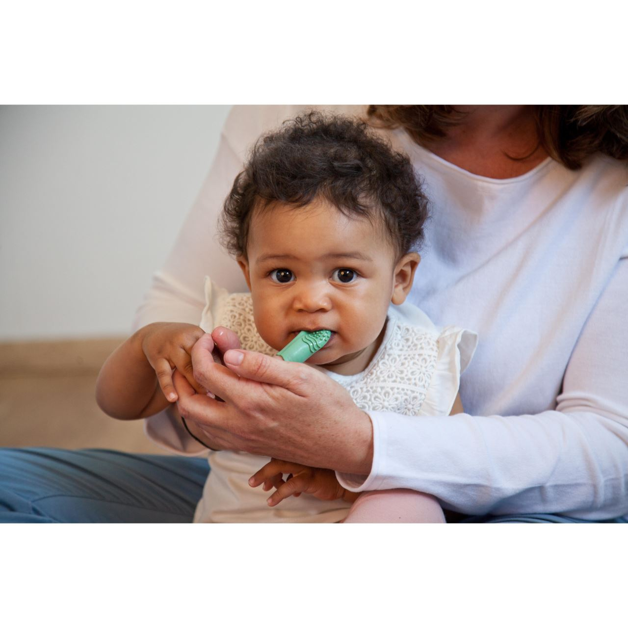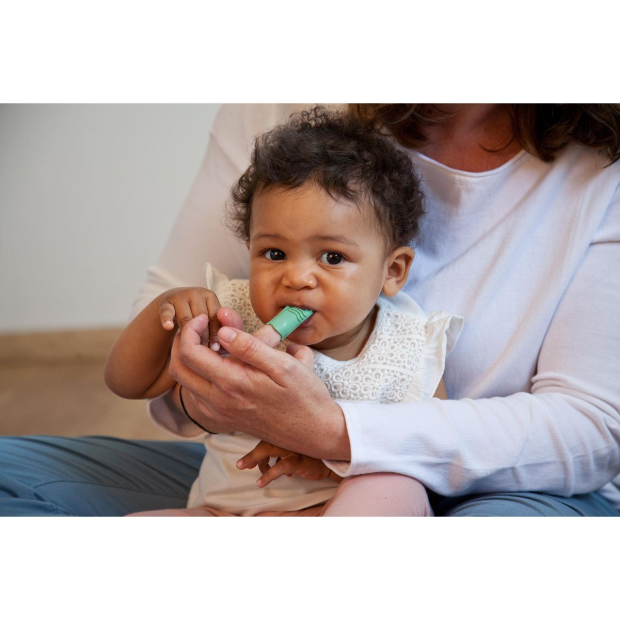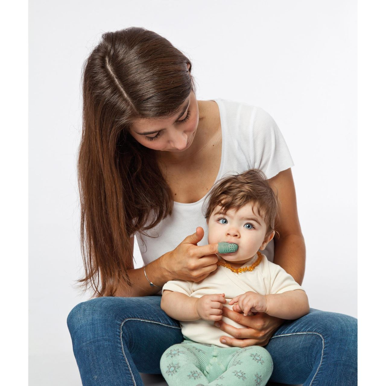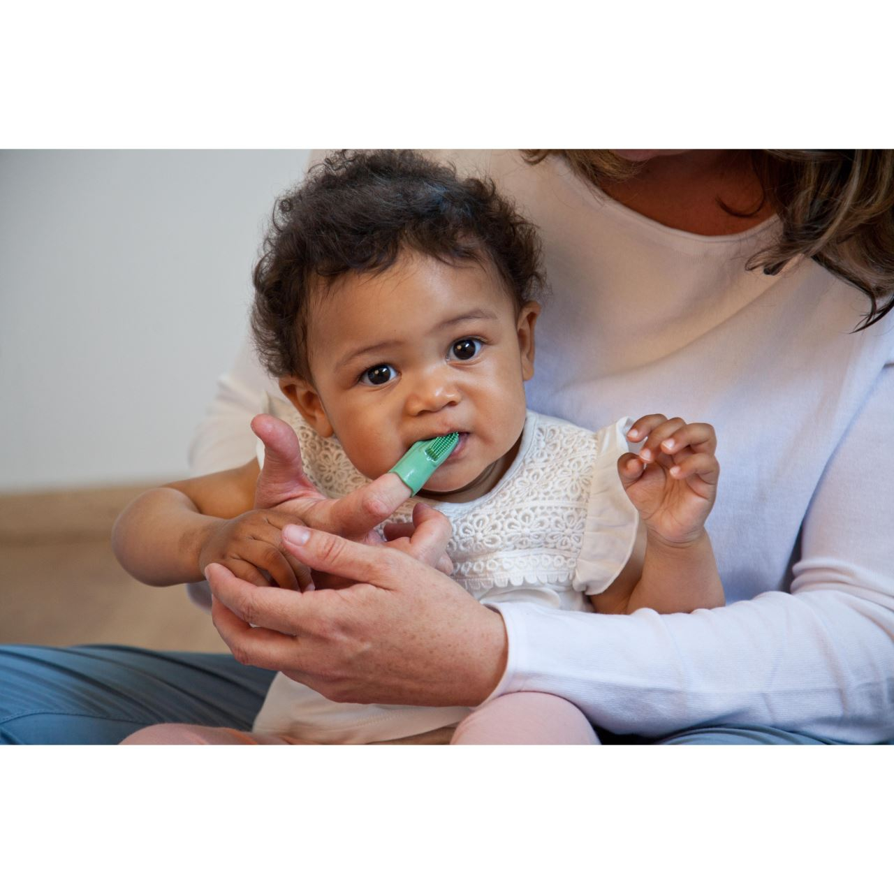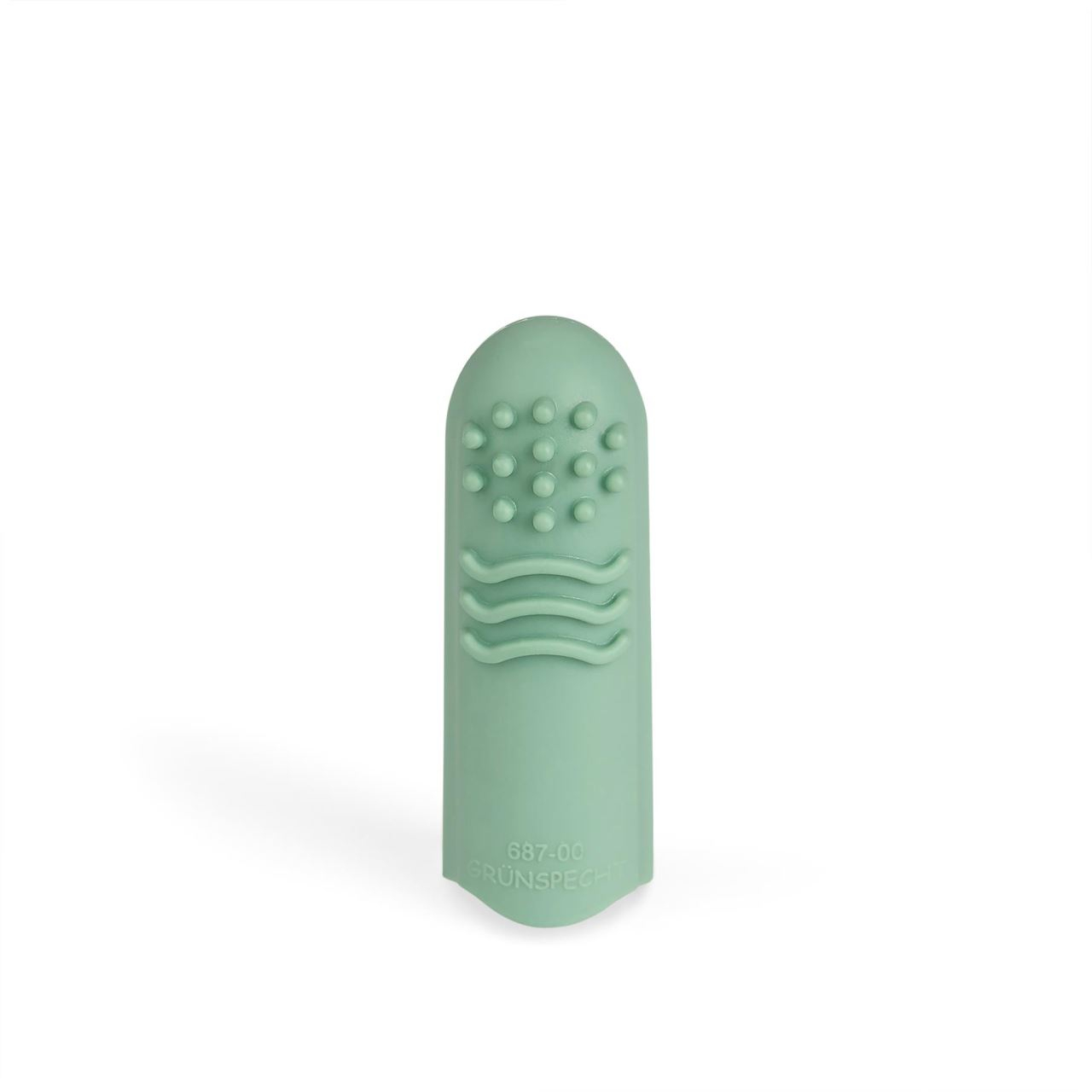 Periuta de dinti pentru bebelusi si copii, pentru folosire pe deget (doar de catre parinti), din cauciuc natural, cu doua fete diferite. Partea cu peri este destinata curatarii delicate a dintilor, iar cealalta fata, texturata, se poate folosi pentru masarea gingiilor si curatarea limbii. Datorita canelurilor flexibile de pe laterale si a materialului moale, periuta de dinti pentru deget este potrivita pentru aproape orice dimensiune de deget. In plus, potrivirea perfecta asigura stabilitatea pe deget. Pozitia periutei de dinti direct pe deget te ajuta sa reglezi presiunea mult mai precis decat daca ai folosi o periuta de dinti obisnuita. Este fabricata din cauciuc natural si nu contine BPA si ftalati.Specificatiile produsului- Pentru curatarea delicata a dintilor si masajul gingiilor copiilor- Are o parte pentru periajul dintilor si o parte pentru masajul gingiilor- Potrivire perfecta pe deget datorita canelurilor flexibile si materialului elastic- Usor de pus si scos datorita inchiderii cu nervuri- Material: cauciuc natural, fara BPA si ftalati- Marime universala
