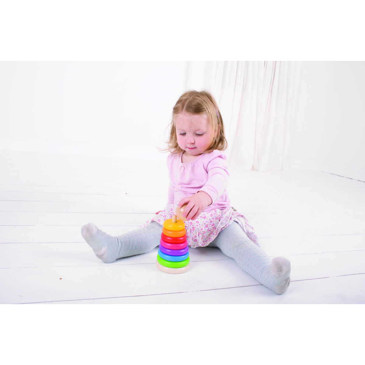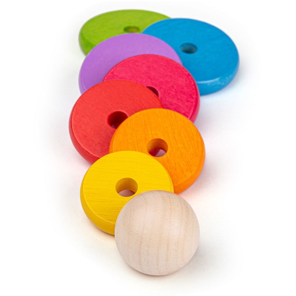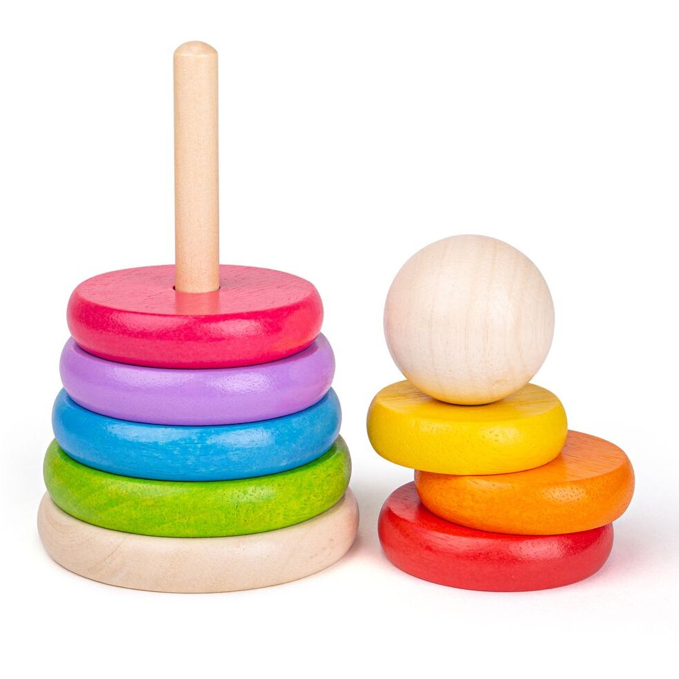 Este o jucarie ideala pentru introducerea conceptului de dimensiune si marime si pentru invatarea culorilor.Cercurile sunt vopsite cu vopsea non-toxica.Material: lemn