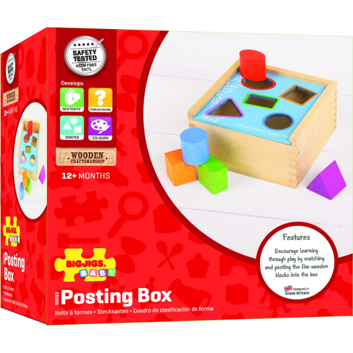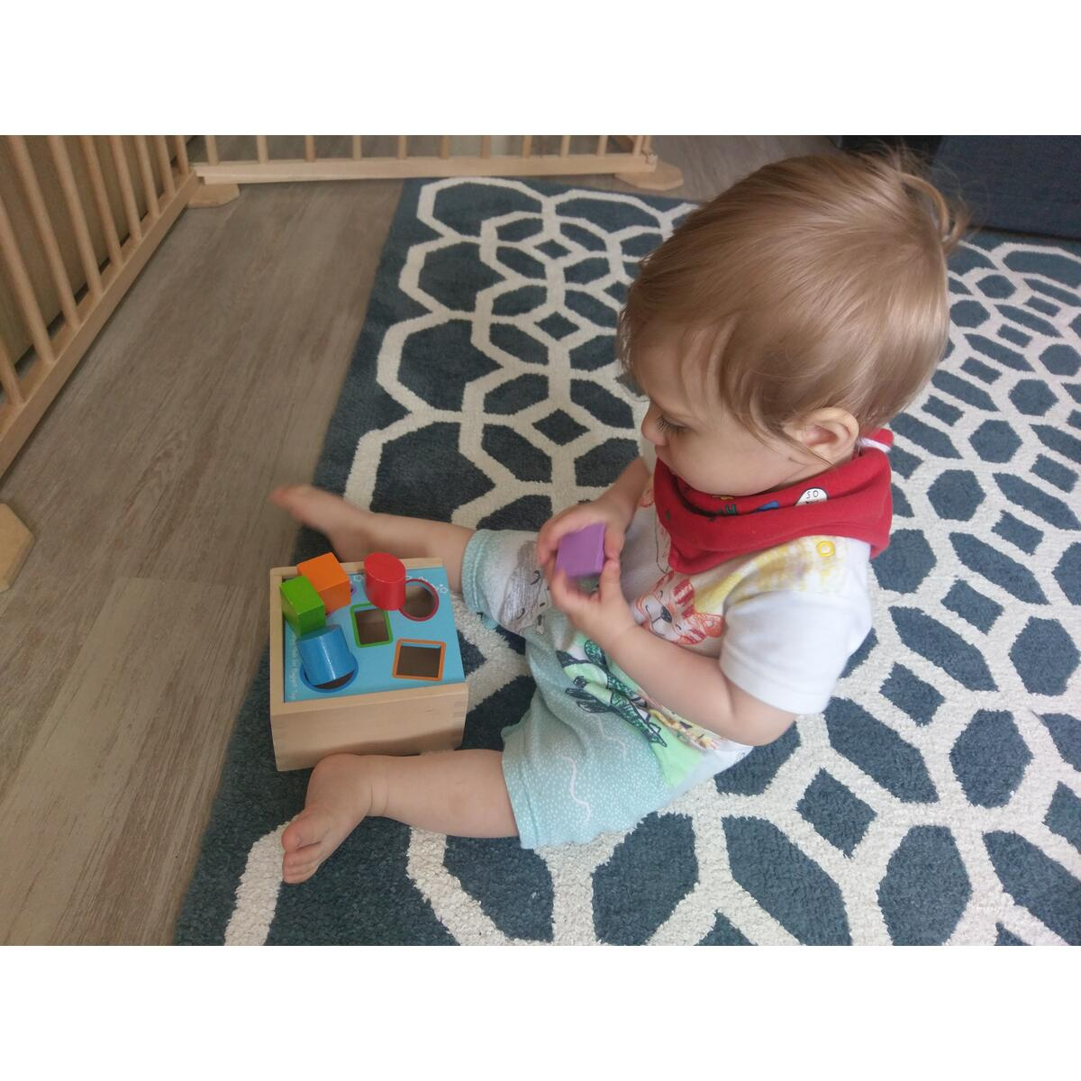 - potriviti formele geometrice cu culorile aflate pe capacul cutiei. - este conceput pentru imbunatatirea dexteritatii si coordonarii mana-ochi. - capacul se poate glisa pentru a facilita scoaterea mai usoara a pieselor introduse in cutie. - este fabricat din materiale de inalta calitate, conform cu standardele europene in vigoare privind siguranta copilului.Setul contine: - 5 piese colorate - cutie depozitareMaterial: lemnVarsta: +1 an