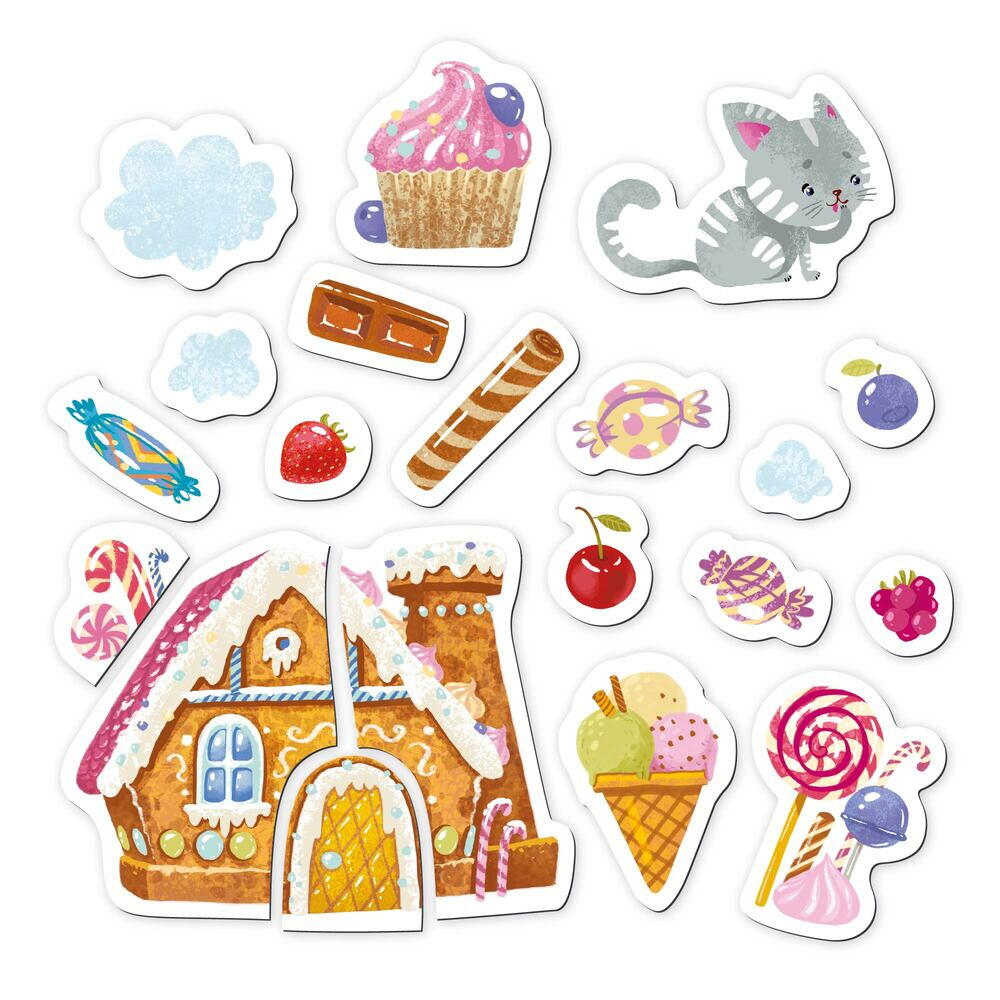 setul contine 20 de elemente magnetice, inclusiv o pisica adorabila, o casa de turta dulce si diverse dulciuri delicioase