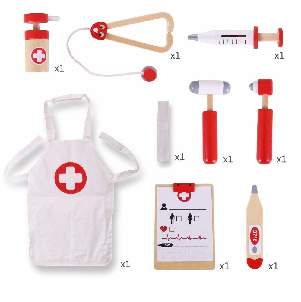 - flacon de crema    - ciocanel pentru testare reflexe    - stetoscop    - otoscop    - termometru    - seringa    - clipboard cu hartie     - sort    - bandaj    - gentuta cu manerMaterial: lemnVarsta: 3 - 7 ani