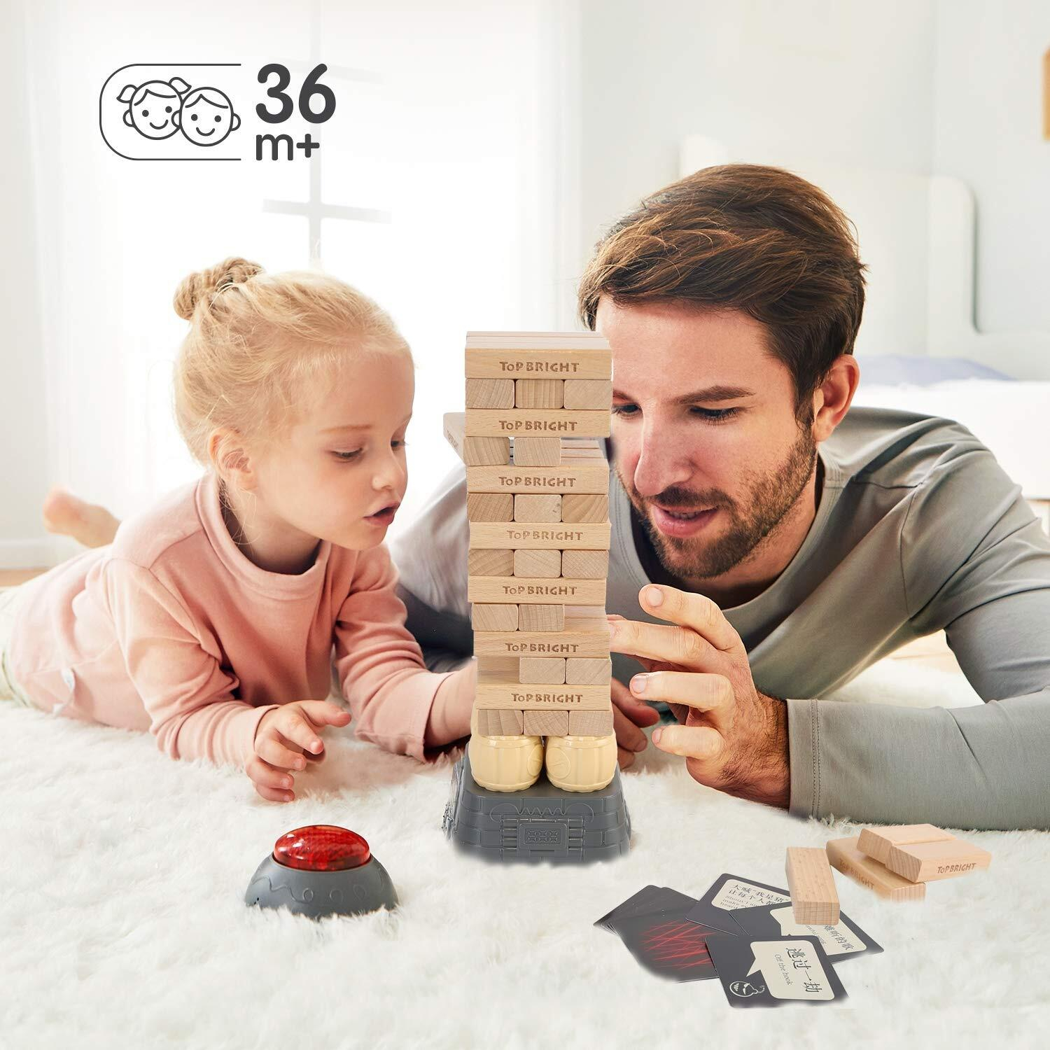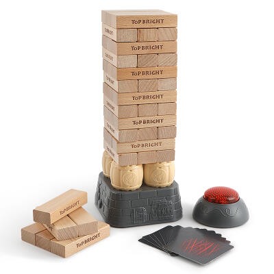 Regulament: Construieste turnuletul cu cate trei piese pe etaj pe baza de plastic cu functie de aruncare in aer. Pune cardurile cu pedepse cu fata in jos pe o suprafata dreapta. Nu uita, cardurile trebuie sa fie bine amestecate. Seteaza cronometru si jocul poate incepe. Scoate cu atentie piesele pe care le vei aseza deasupra turnuletului, avand mare grija sa nu darami constructia. Dupa ce ai extras piesa, apasa pe buzzers. Jocul se incheie cand turnuletul se darama si buzzers-ul incepe sa emita sunete si lumini. Jucatorul la care s-a daramat turnuletul trebuie sa extraga un card, sa citeasca cu voce tare pedeapsa si sa o indeplineasca.