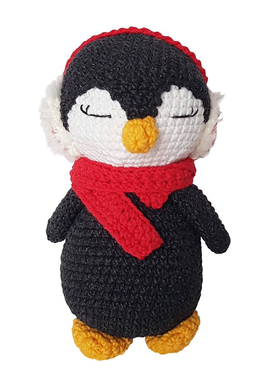 Jucarie crosetata manual - Pinguin cu fular rosuPinguinul cu fular si casti este crosetat manual din bumbac si PAC.