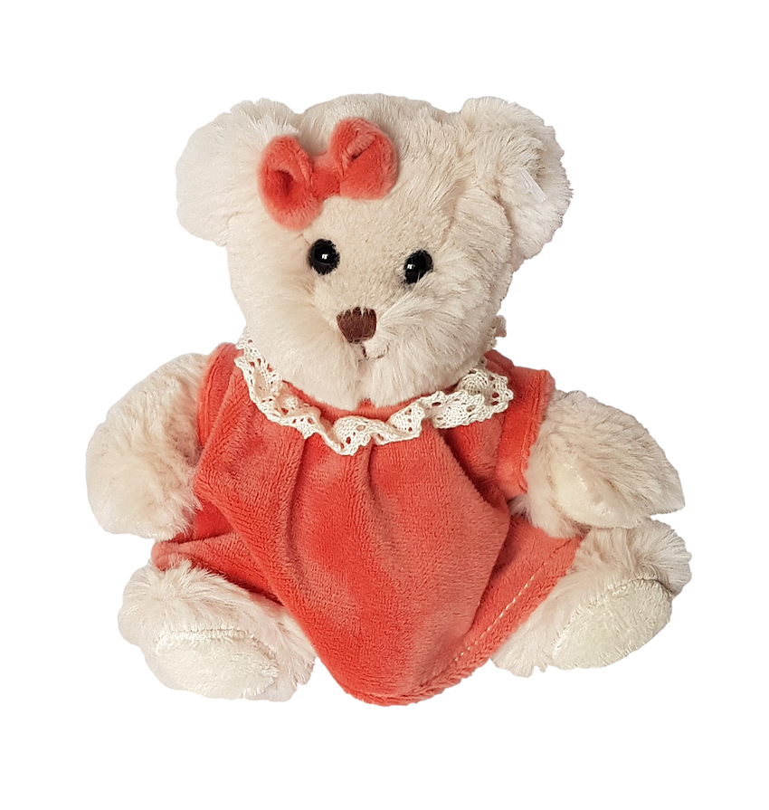Ursulet cu rochitaFetita ursoaica are o rochita portocalie de catifea si o dantela decorativa din bumbac aplicata pe rochita. Ca detaliu, o fundita tot de catifea in aceeasi nuanta cu rochita, este prinsa aproape de urechiuse.Materialul din care este confectionat ursuletul este de foarte buna calitate, moale si catifelat, cu detalii atent lucrate;Inaltimea : 17 cm.Greutatea : 83g.Material: fibre sintetice. NU contine substante toxice.Varsta recomandata: +3ani.