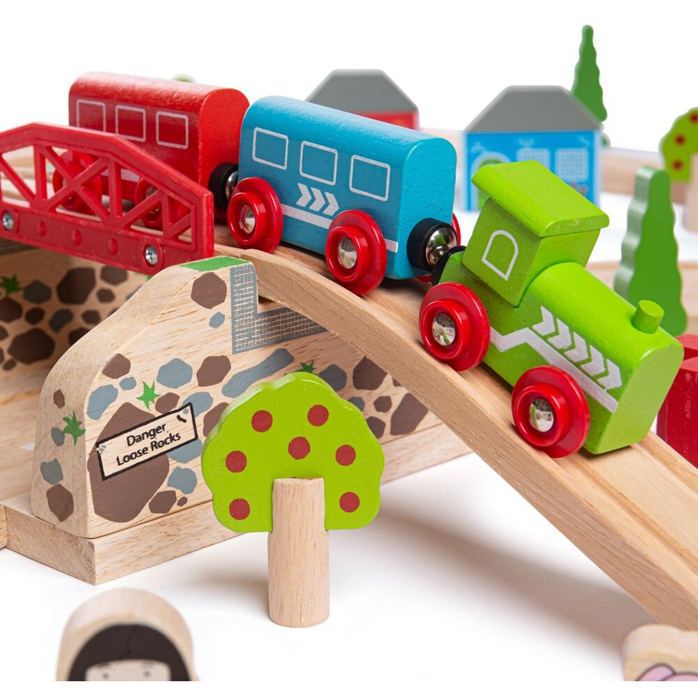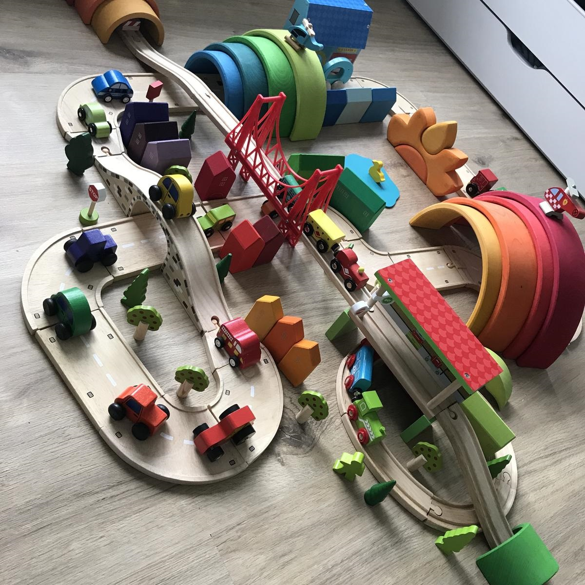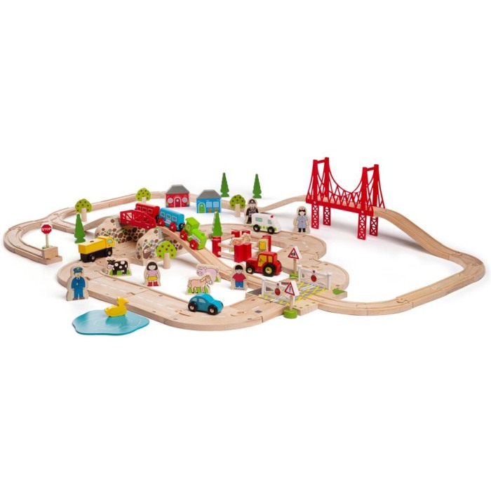 Setul cuprinde 80 piese: - sosea - cale ferata - poduri - vehicule - trenulet - cladiri - oameni - ferma de animale - copaci - indicatoare rutiere, etc.Pentru extinderea acestuia si automat mai multa actiune, setul poate fi imbogatit cu elemente suplimentare provenind de la alte jocuri similare.Material: lemnVarsta: +3 ani