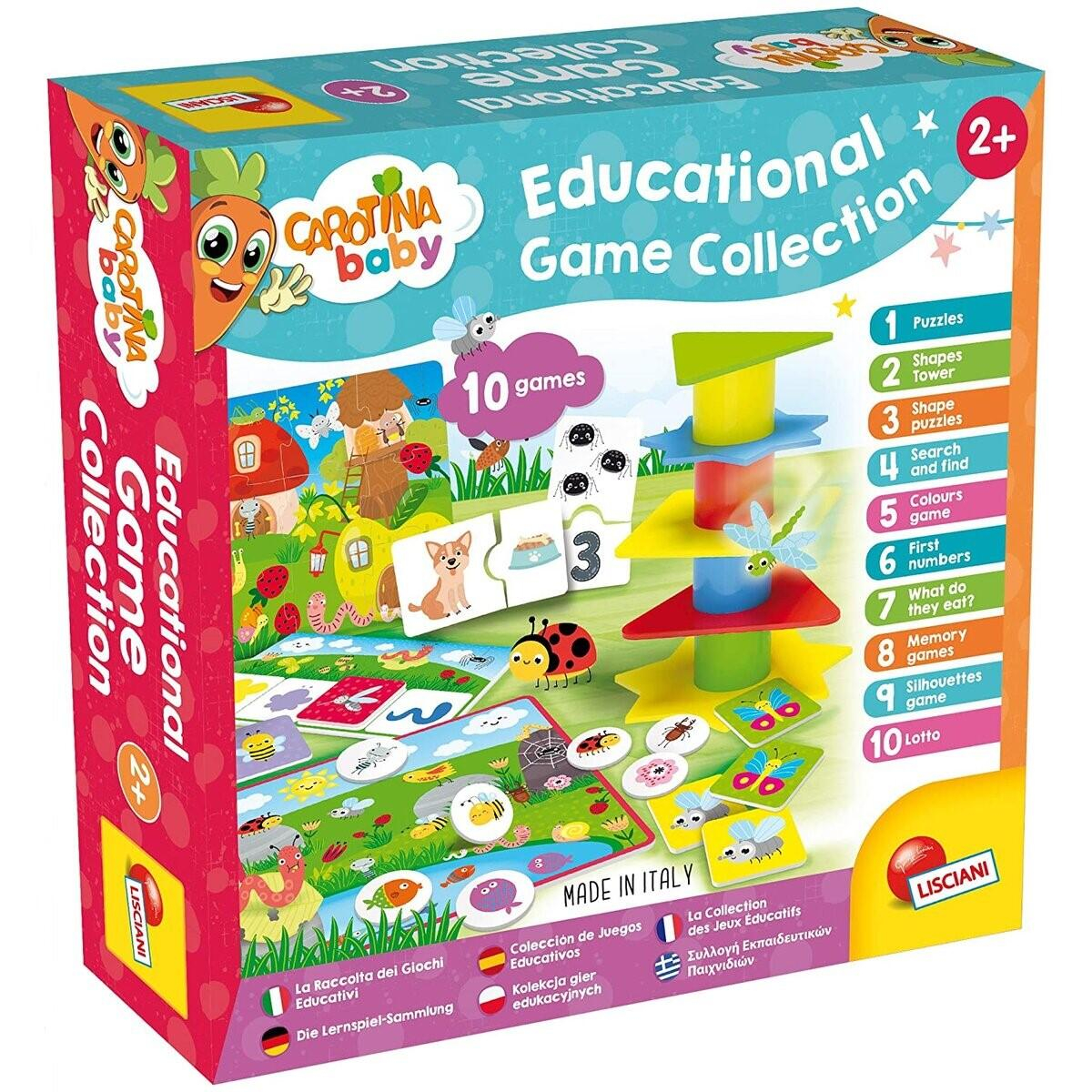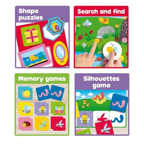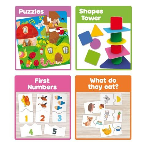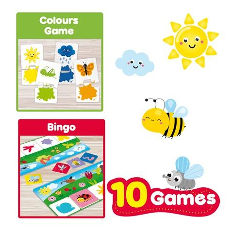colectia de jocuri 10 in 1 include: puzzle-uri, turnulet cu forme geometrice, puzzle cu forme, joc tip cauta si gaseste, joc cu culori, joc cu numere, joc de asociere animalute-alimente, joc de memorie, joc de memorie cu siluete si joc de Bingo