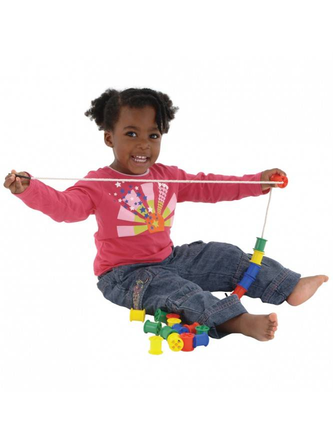 setul include 20 de bobine din plastic rezistent, divers colorate si un fir din bumbac pentru activitati de indemanare si coordonare