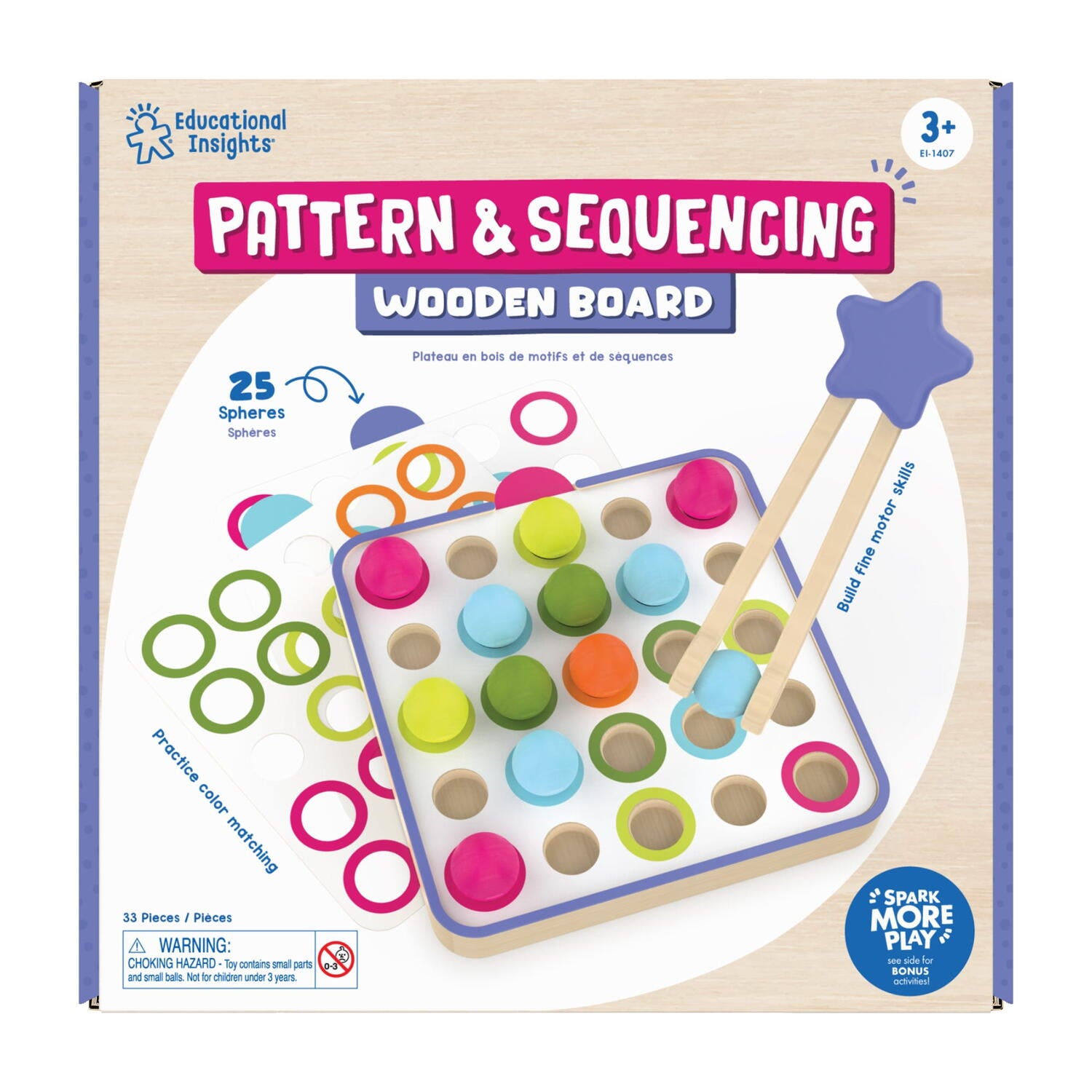 copiii pot urmari cardurile cu modele sau pot crea propriile secvente colorate folosind sfera si penseta din lemn, dezvoltandu-si gandirea logica si creativitatea.