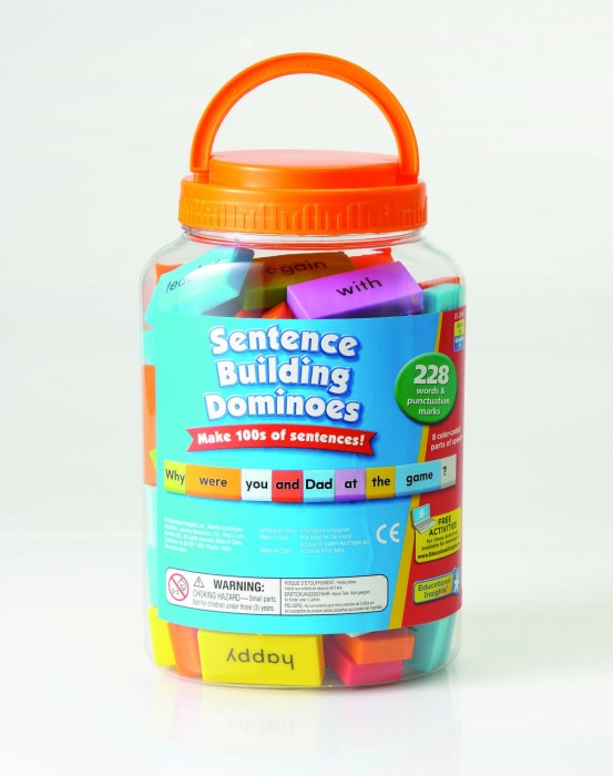 Formeaza propozitii scurte sau chiar adevarate fraze folosind piesele colorate ale jocului domino cu propozitii.