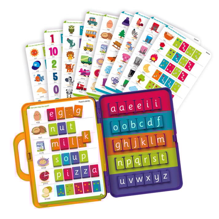 Aceasta jucarie educativa face parte dintr-o colectie populara de serviete cu activitati scolare variate, create special pentru copii de la 5 ani. Cu ajutorul acestui joc, copilul tau va invata sa citeasca, sa formeze cuvinte si sa le desparta in silabe, va exersa vocabularul in limba engleza si isi va dezvolta abilitatile de scriere, totul prin joaca!