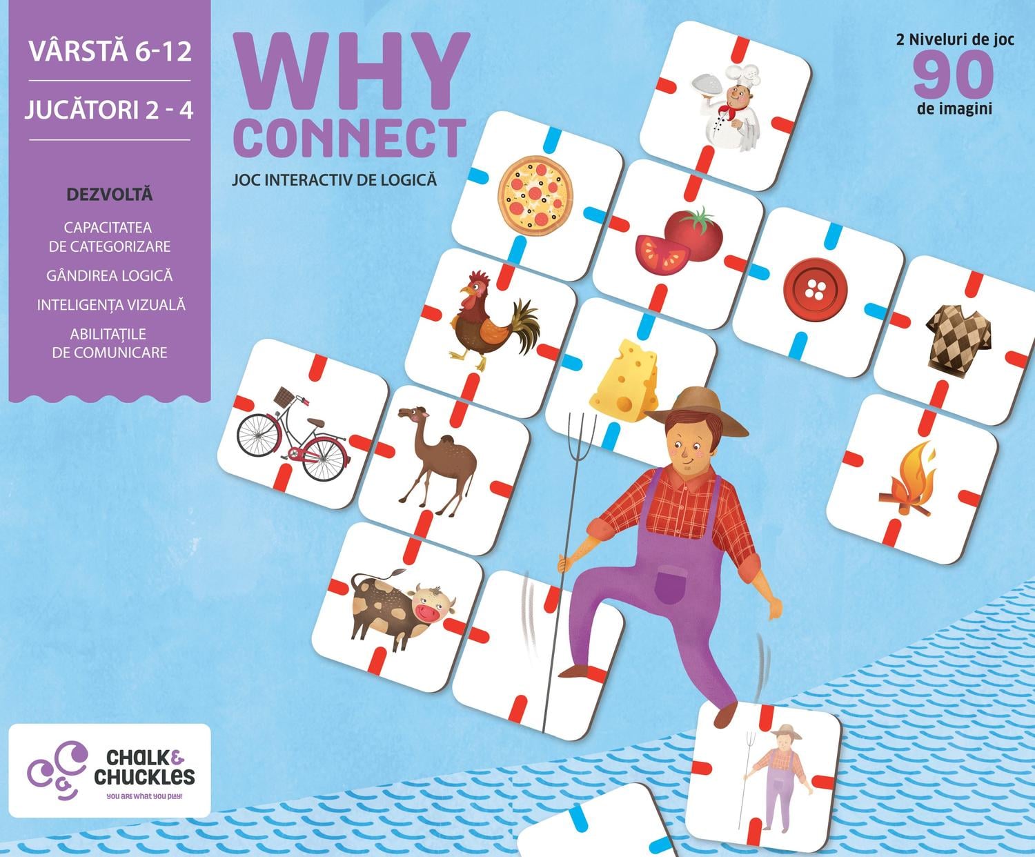 Joc interactiv - Why Connect?Un super joc de logica de care nu te vei plictisi niciodata!In plus, nu depinzi de nici o tablita de joc si ai nevoie doar de o suprafata dreapta pe care sa pui piesele. Ajuta piesele de joc cu imagini sa se "imprieteneasca", descoperind nenumarate conexiuni logice intre ele. Cu cat vei face mai multe conexiuni intre piese atunci cand este randul tau, cu atat mai multe puncte vei primi. Rosteste cu voce tare argumentul pentru conexiunea respectiva si vezi ce parere au prietenii tai! Oare vor accepta sau vor respinge argumentul tau? Copiii isi vor dezvolta capacitatea de comunicare prin limbaj verbal