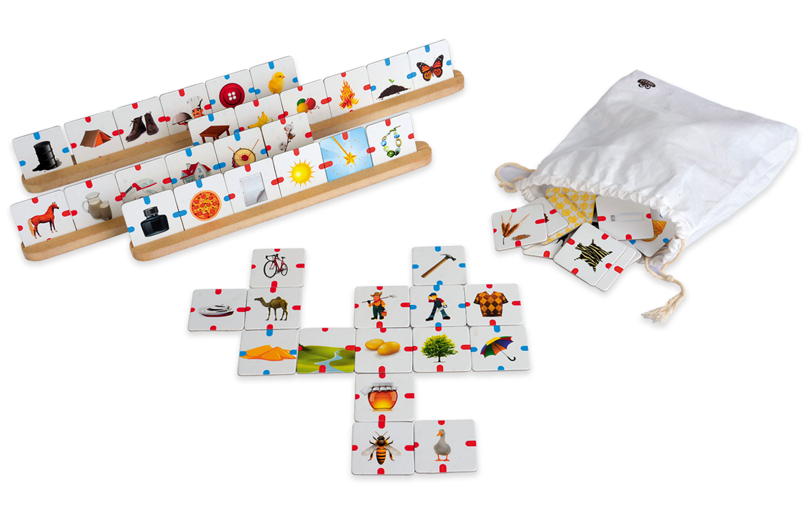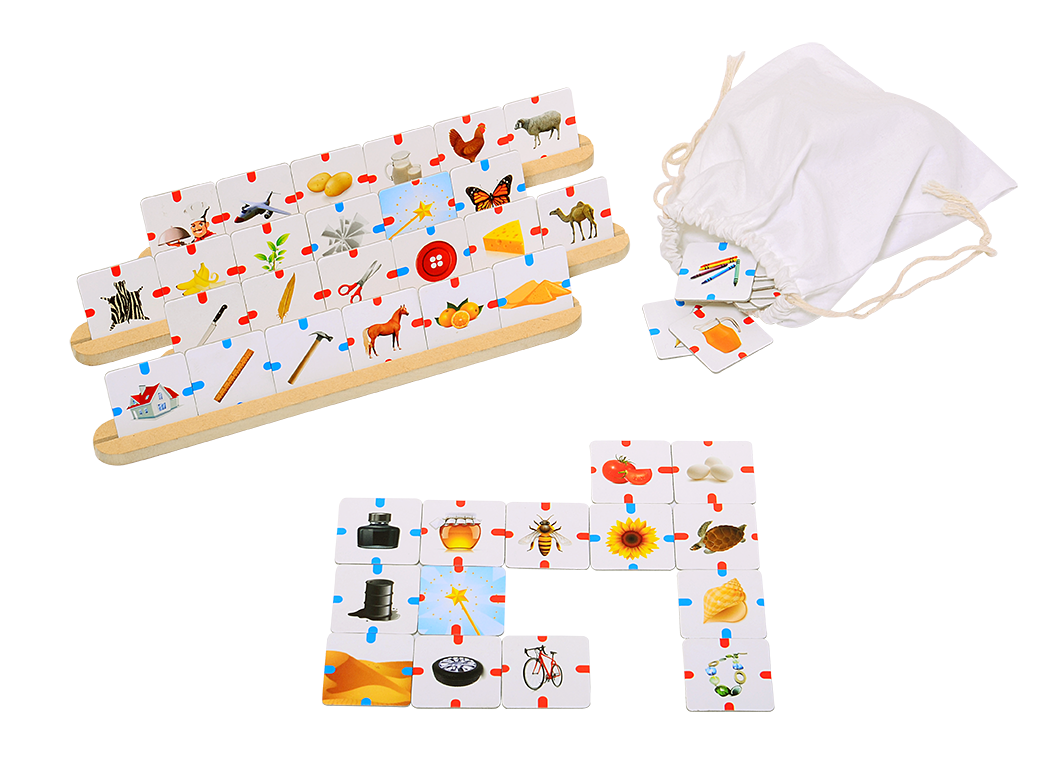 - 90 de piese cu imagini- 4 suporturi din lemn pentru piesele cu imagini- 1 saculet din material textil- carnetel pentru inregistrarea scorurilor- 1 brosura cu exemple de conexiuni logice- instructiuni de utilizareMaterial: hartie / carton reciclat / lemn / textilVarsta: +6 ani